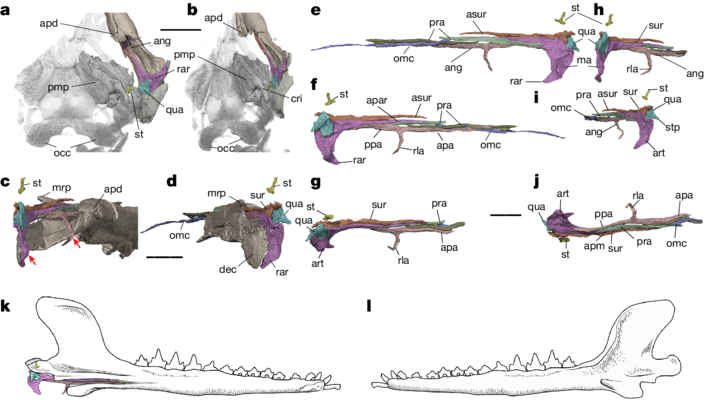五十年前,主要基于产自中国云南禄丰的摩根齿兽标本,建立起了摩根齿兽头骨-颌骨双颌关节这个哺乳动物中耳演化的关键一环。双关节外侧是哺乳动物的齿骨-鳞骨关节,内侧是关节骨-方骨的爬行动物关节。在这个基础上,哺乳动物中耳渐进演化的假说就已经基本成形,但这个假说缺失很多演化环节的化石证据。
