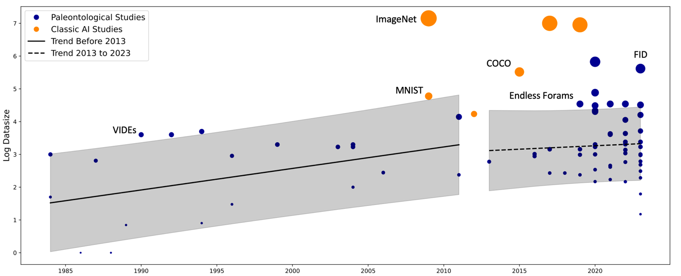图3. 人工智能古生物学数据集(蓝色)与主流人工智能数据集(橙色)大小对比