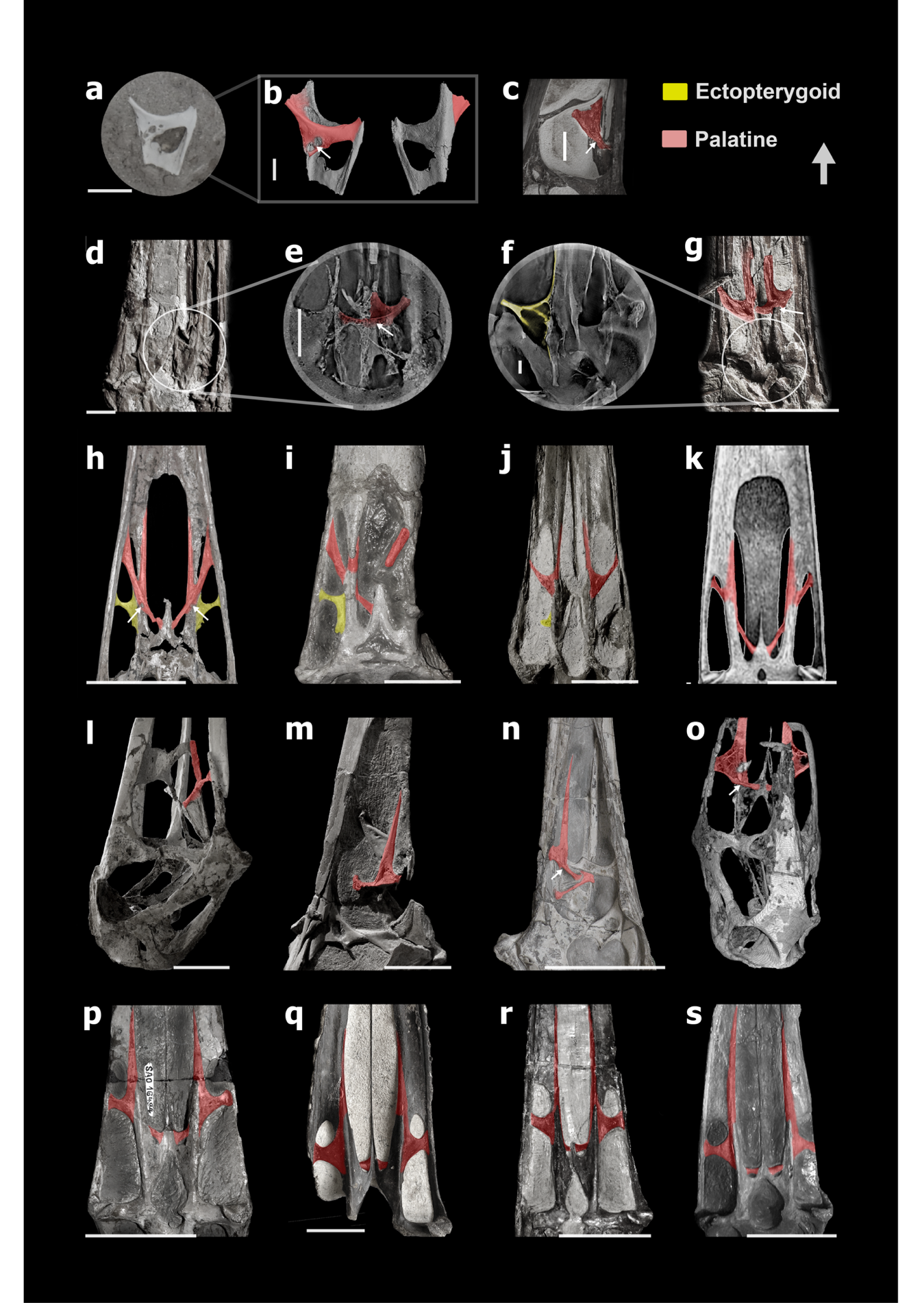 新模式明确了内鼻孔外侧向后第一个窗为上颌骨腭骨窗,而不是前人所认识的腭后窗,而与其它主龙类同源的腭后窗则在上颌骨腭骨窗之后。在一些翼手龙类群中,由于前后分隔腭后窗和颞下窗的外翼骨并未与腭区边缘相接,腭后窗则与颞下窗合二为一。关于这些骨骼结构的厘定,得益于本次研究利用高精度CT扫描和三维重建骨骼结构关系。之前关于上颌骨的腭区,包括腭骨、翼骨、外翼骨形态结构和延展位置均有不同的推测,如将腭骨外支的部分推测成外翼骨,将外翼骨推测成翼骨外突等等。本次研究则明确了这些骨骼的形态和接触关系,如翼手龙类中呈现出Y型的腭骨,翼骨前突腹侧叠覆腭骨的结构关系等。