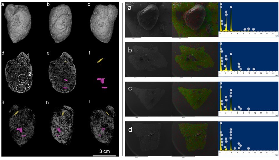图2. 左图,Cuocopros yuanmouensis igen. et. isp. nov.粪化石2015-LCZN-T1-135.5.6的CT扫描图像,黄色为未知骨骼碎片,紫色可能为小型哺乳动物肩胛骨碎片;右图,Cuocopros yuanmouensis igen. et. isp. nov.扫描电镜图像(SEM)以及X射线能谱分析(EDS),扫描电镜图像中绿色部分对应了表中(Ca)的钙元素。(保罗·拉米 供图)