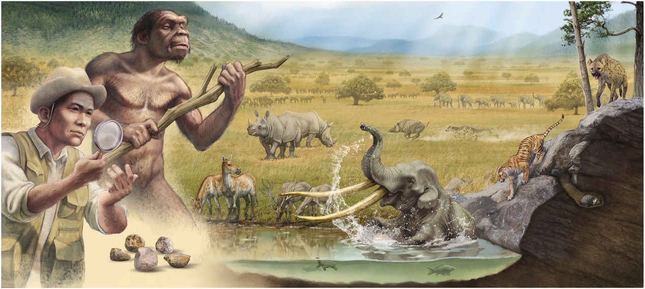 孢粉分析(图3)显示早更新世时期亚热带常绿阔叶林和耐旱草本灌木在区域内的共存,表明这一时期气候相对温暖,水汽蒸发量较高,植被景观较为多样。与区域其他孢粉记录,共同支持元谋盆地的植被气候可能正处于向干热河谷类型过渡的重要阶段。在这种古生态环境下,大、小型哺乳动物共存且存在迁徙行为;植食性动物和食肉类动物在生态系统中占据不同的生态位,形成了复杂的食物链。研究人员推断这一时期的气候条件对哺乳动物的演化和迁徙模式产生了重大影响,并对其后元谋人的出现起到关键性作用。同时,该研究为探讨早更新世动植物群与早期人类(元谋人)在同一生态环境下的相互关系提供了重要依据(图4)。