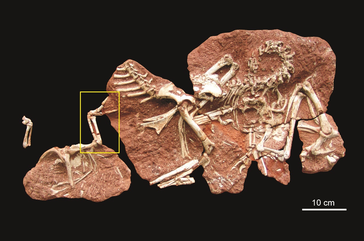 图1. 黄氏河源龙的模式标本,黄框内为图2所展示的前肢部分