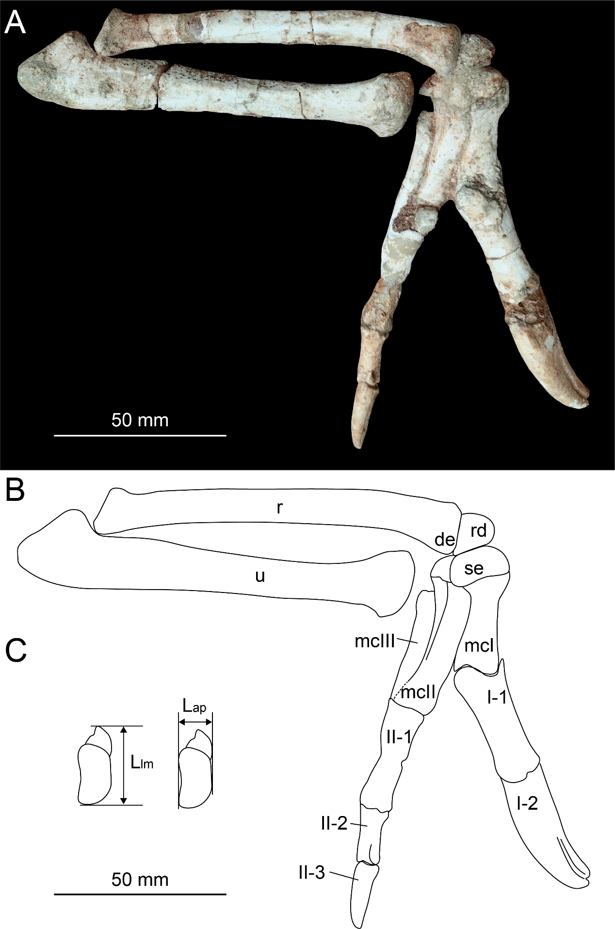 图2. 黄氏河源龙(HYMV 1-2)右前肢照片(A)和线条图(B),以及对半月形腕骨的测量(C)