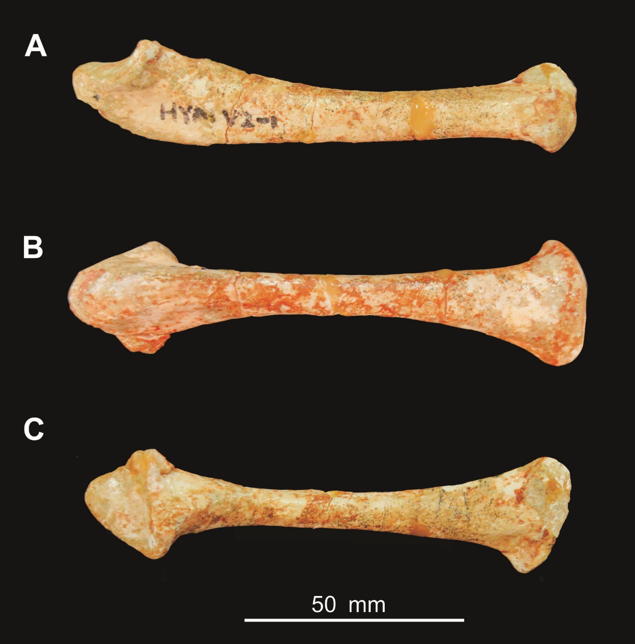 图3. 黄氏河源龙(HYMV 2-8)尺骨的侧视(A),腹视(B)及背视(C)