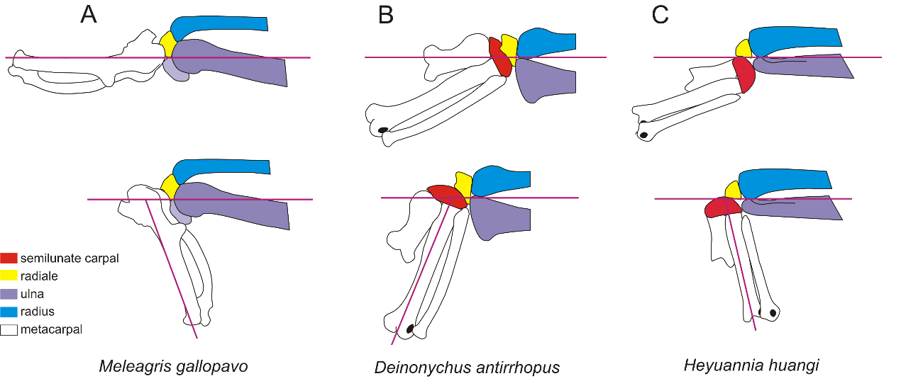图4. 火鸡(A)、恐爪龙(B)和黄氏河源龙(C)的腕部,上图为最小外展,下图为最大外展(即收拢手部)