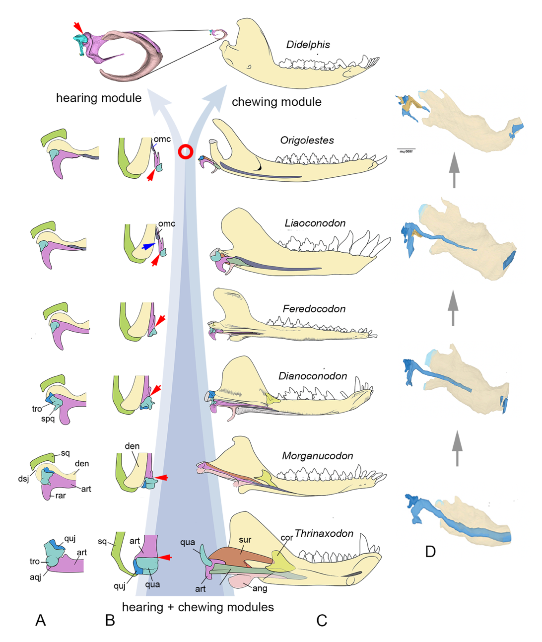 图2. 哺乳动物颌关节、中耳演化的主要阶段以及它们与现代哺乳动物中耳以及下颌关节发育的对比。
