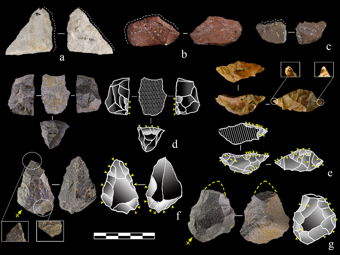 对于吉家庄遗址出土的石制品组合,团队对其进行原料利用和技术类型学研究,对剥片模式以及修理策略等相关指标进行统计分析。结果表明,古人类采取远距离(7-10km)搬运原料的策略,异地原料的获取影响了石制品技术组合的表现。硬锤锤击法是剥片的基本技术,石料的外部形态和天然角度,成为石核剥片模式的主要制约因素,而缺乏剥片组织性和剥片角度维护,使得大部分石片呈现出形态不规则的特征。然而,石核的长序列剥片和较高的石核消耗率同样引人注目。值得一提的是,石制品组合中经过第二步修理的产品含量较高(10.3%),石器类型多样,刮削器、凹缺器、钻和尖状器等修理技术特征鲜明,甚至表现出修理程序标准化;多样的石器类型可能指示了古人类对多种资源开发利用的不同策略。