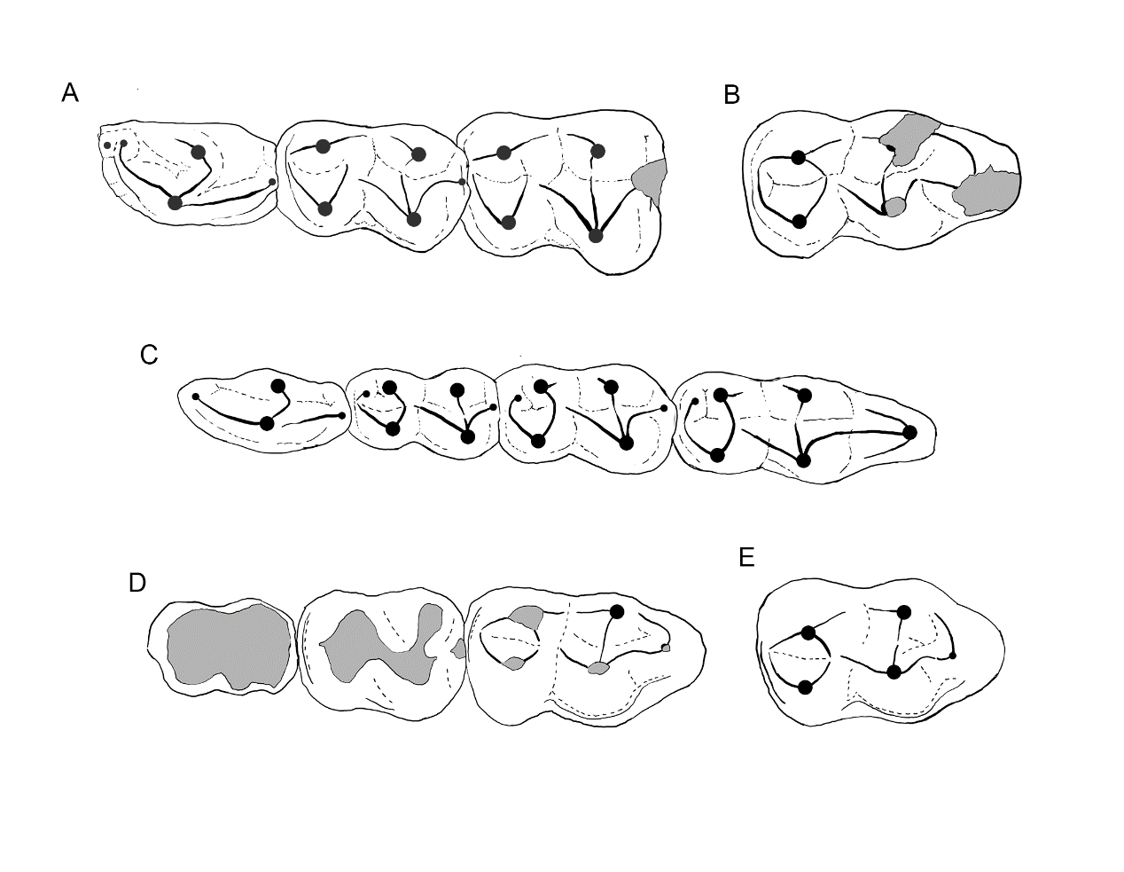 图2. 周氏石林猪(A)颊齿列与垣曲“戈壁猪”(B)、东方戈壁猪(Gobiohyus orientalis)(C)及拉氏邦唐猪(D, E)形态学对比