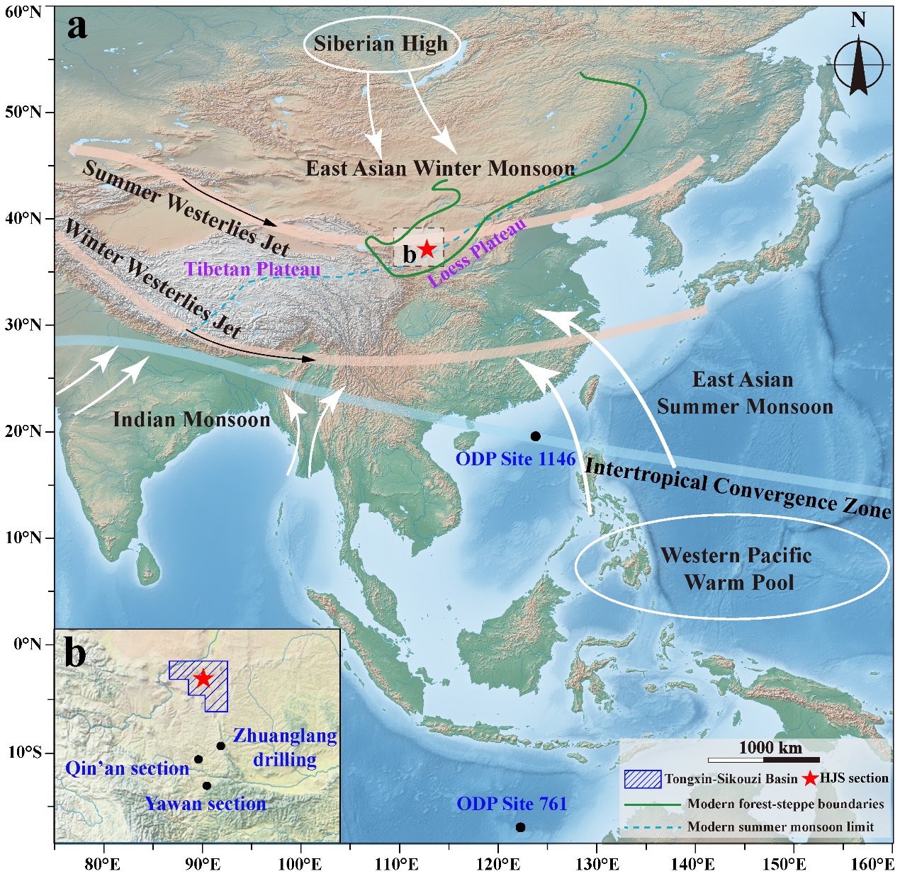 图1.同心盆地的位置及研究区的大气环流模式。该区位于东亚夏季风边缘区和林草过渡带,生态植被对气候变化较为敏感(王建 供图)