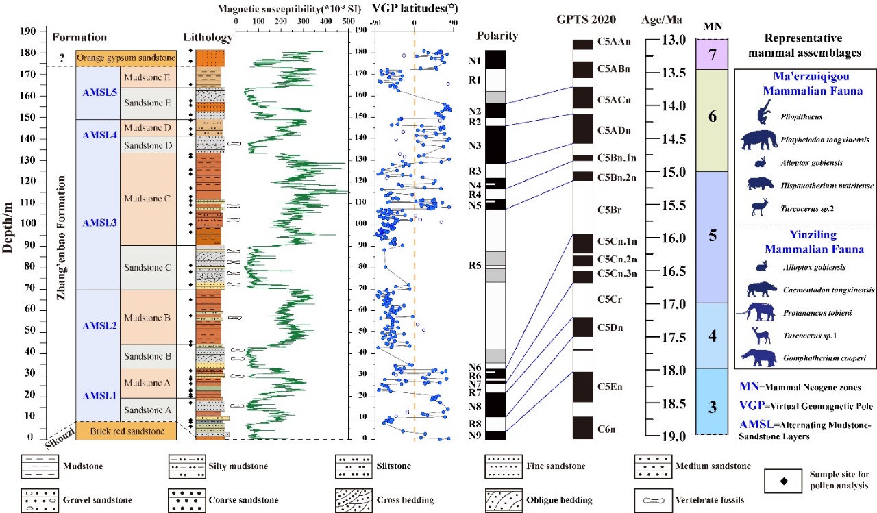 图2.同心盆地黄家水剖面的岩性、生物地层学、磁化率记录和磁性地层学,及其与全球极性年表的对比 (王建 供图)