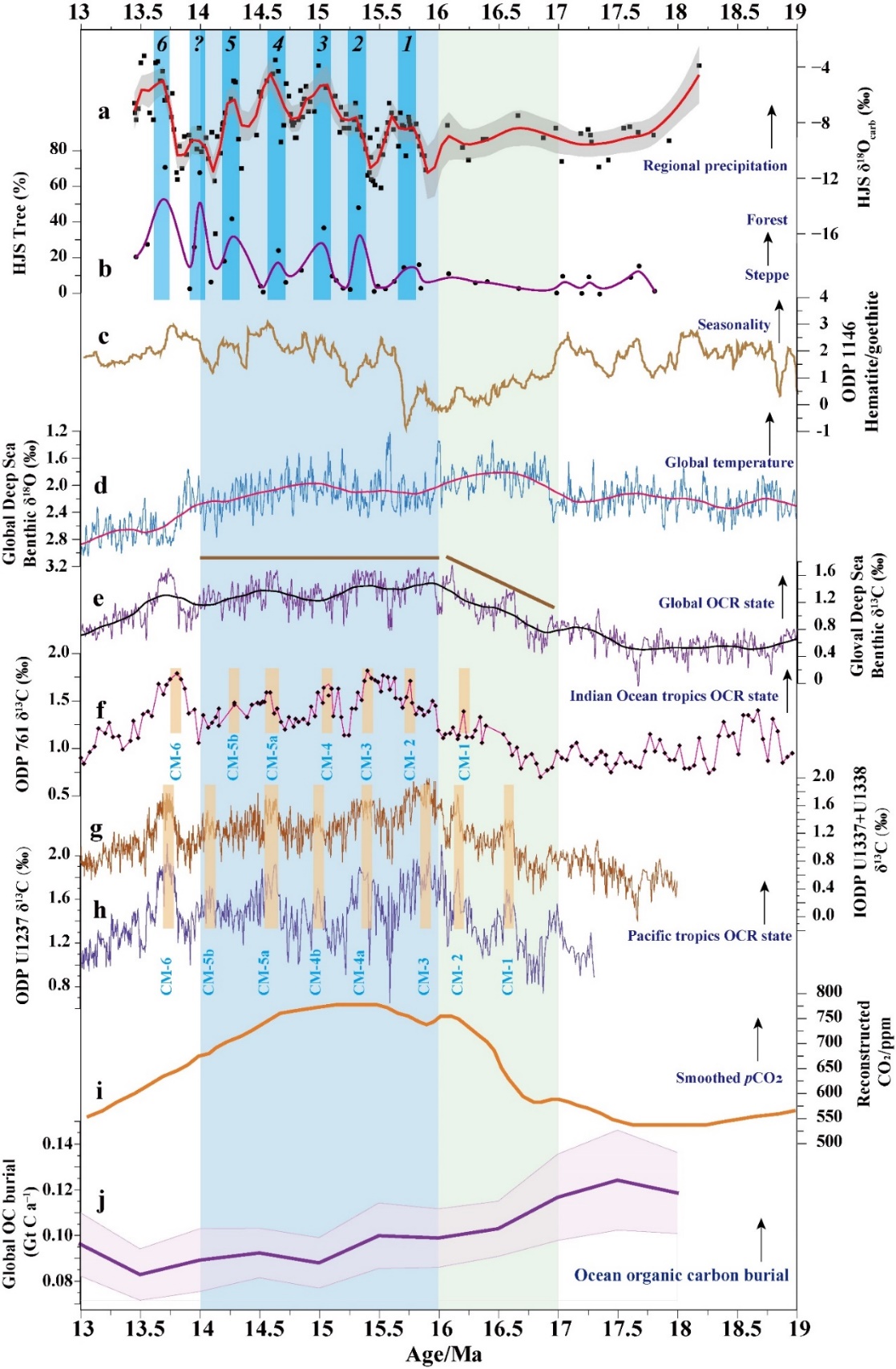图3.同心盆地的碳酸盐氧同位素(a)、花粉(b)记录与 19-13 Ma 期间的全球及区域海洋重要钻孔的底栖有孔虫氧碳同位素(d-h)、CO2浓度(i)及全球有机碳埋藏率(j)记录的对比。CM/Cmax事件指碳同位素极大值事件,亦称蒙特利碳位移(Monterey carbon isotope excursion)。海-陆记录对比显示区域植被气候在MCO早期(17-16 Ma)和晚期(16-14 Ma)呈现两阶段的演变特征,与海洋碳库模态变化较为相似 (王建 供图)