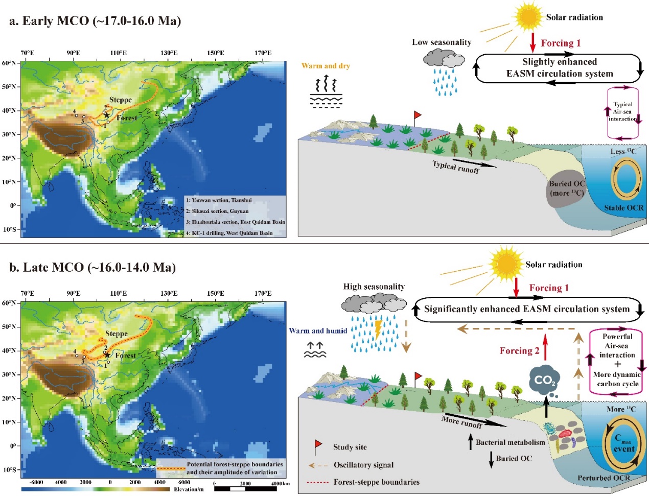图4.中新世气候适宜期早期 (a) 和晚期 (b) 海洋碳库通过东亚夏季风调控大陆林地-草地边界移动的动力机制示意图 (王建 供图)