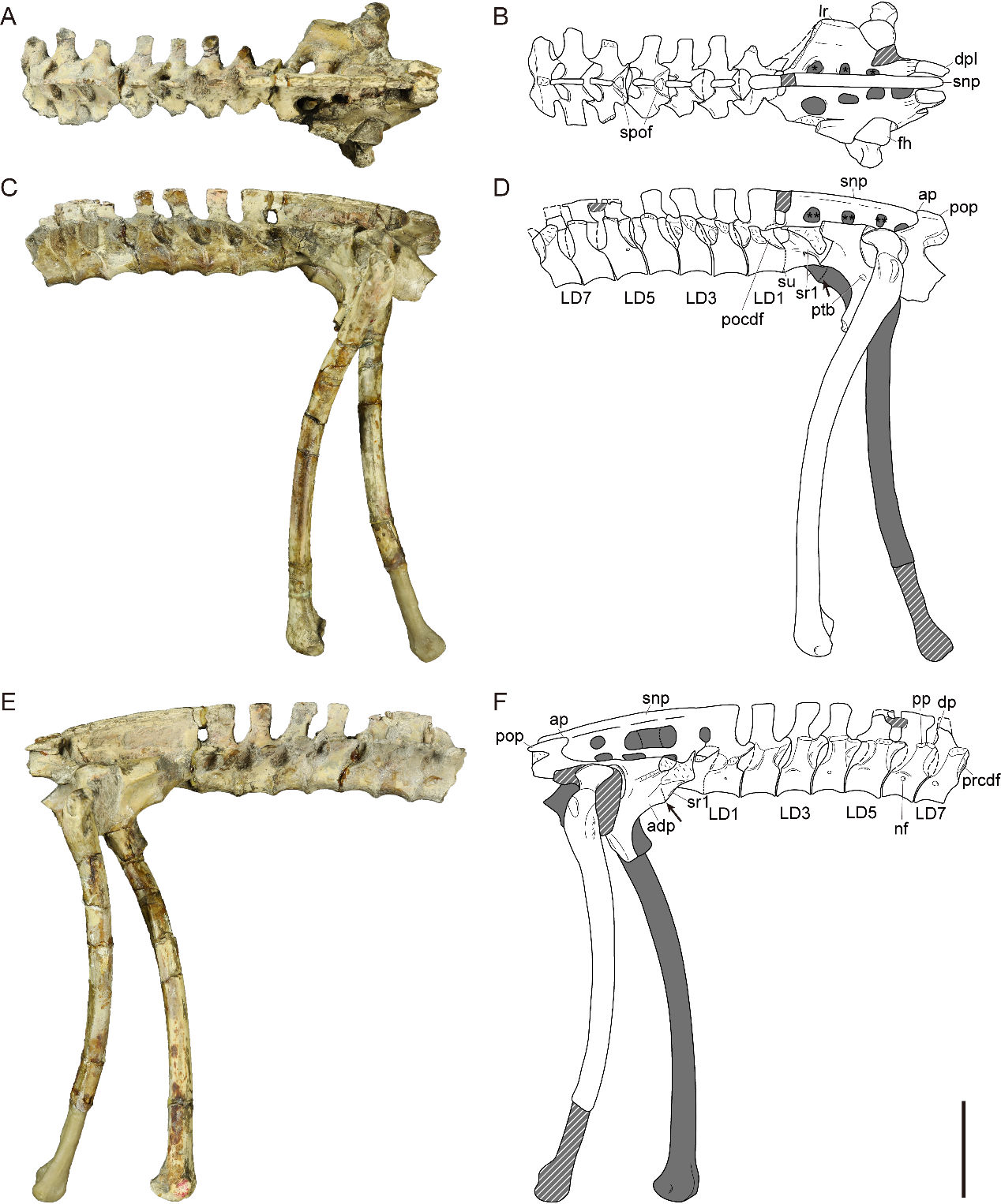 图2. 准噶尔翼龙正模标本关联背椎、荐椎、腰带及股骨