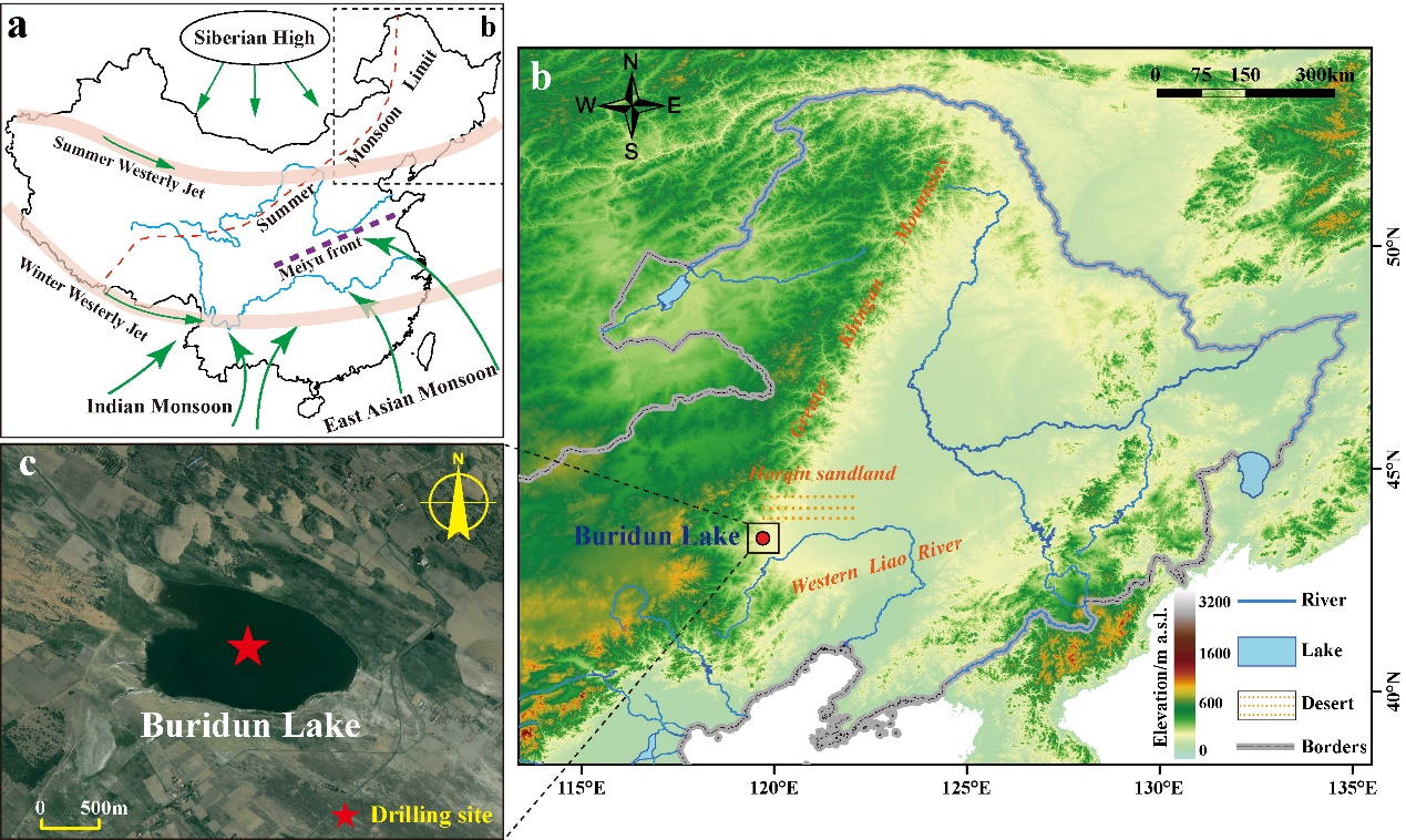图1.研究区气候背景、地理位置及钻孔采样点。(a) 中国主要大气环流系统,东亚夏季风和印度夏季风将大量水分从热带地区输送到中国南方,梅雨是指中国江淮流域初夏(6-7月)由冷暖气团汇聚形成的准静止锋所引起的雨季。(b) 研究区域地形水系以及研究点的地理位置。(c) 布日敦湖及钻探点位(王建 供图)