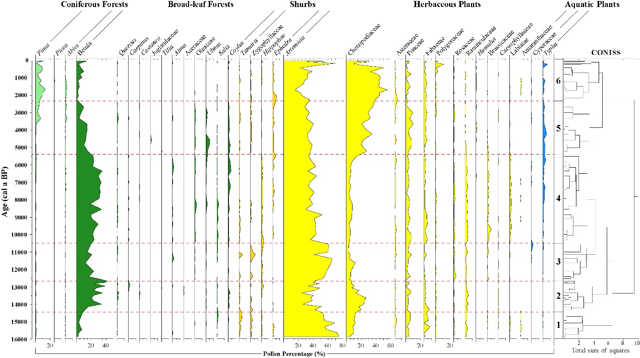 图2.布日敦湖~16.0 ka以来主要植被类群的花粉百分图谱(王建 供图)