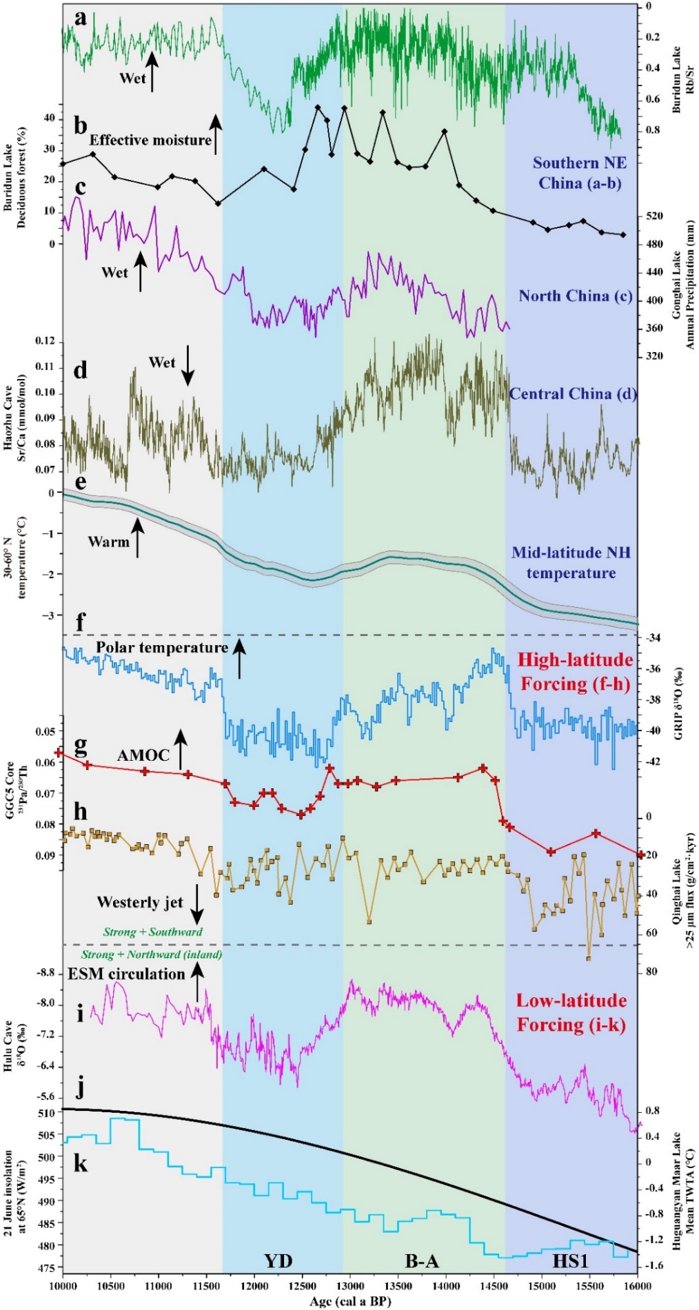 图3. 东北南部植被-气候数据与 16-10 ka 区间内的区域和全球记录的对比。 (a)布日敦湖 Rb/Sr 比值代表夏季降水强度; (b) 布日敦湖落叶森林花粉百分比指示有效降水; (c) 华北公海湖年降水量重建; (d)豪猪洞Sr/Ca比值表明中东部水文气候变化; (e) 北半球(30°–90°N)综合温度记录; (f) 格陵兰冰芯NGRIP δ18O反映的温度记录; (g) GGC-5钻孔231Pa/ 230Th比率指示的北大西洋经向环流(AMOC) 强度; (h) 青海湖西风气候指数; (i) 葫芦洞石笋 δ18O 记录表明的东亚季风环流强度; (j) 印度-太平洋暖池的热含量变化; (k)北纬 65° 夏季太阳辐射。 其中浅紫色、绿色和蓝色背景分别表示HS1、BA 和 YD。