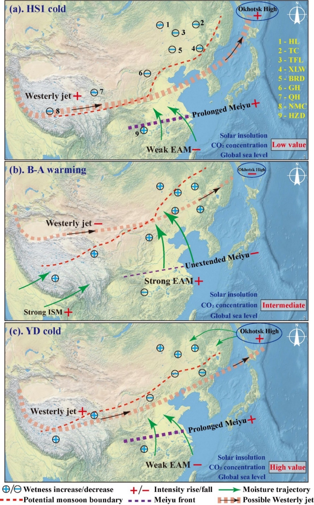 图4.末次冰消期HS1 (a)、B-A (b) 和 YD (c) 期间季风-西风跷跷板变化对中国水文气候影响的概念示意图。其中西风急流与季风的交汇带基于古气候记录的相位关系,并参考现代地形和气象资料,西风急流与鄂霍茨克高压之间的潜在关系是基于现有记录的初步猜想(王建 供图)