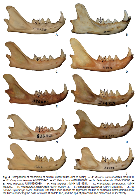 图2.猫族物种下颌对比,C-J是豹猫,猫和兔狲所在的支系
