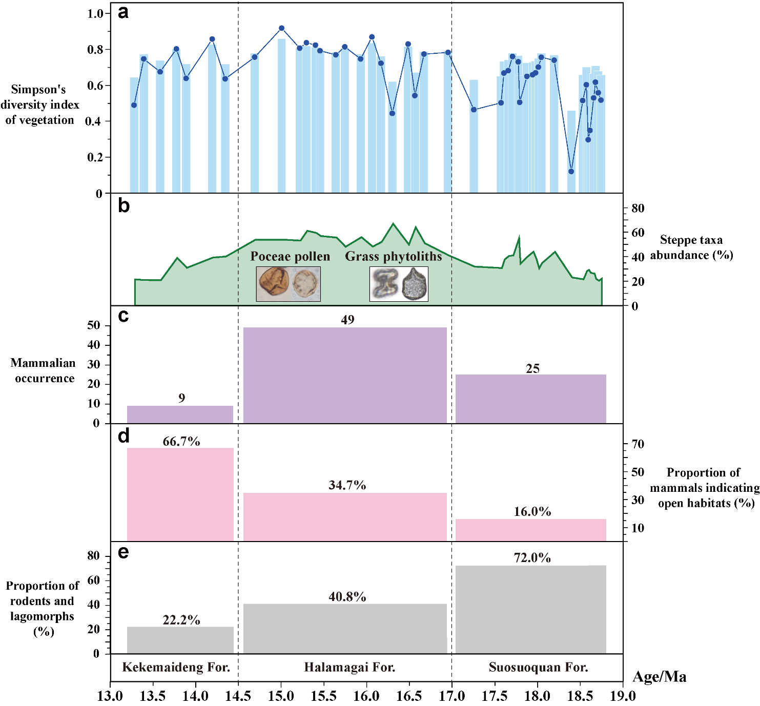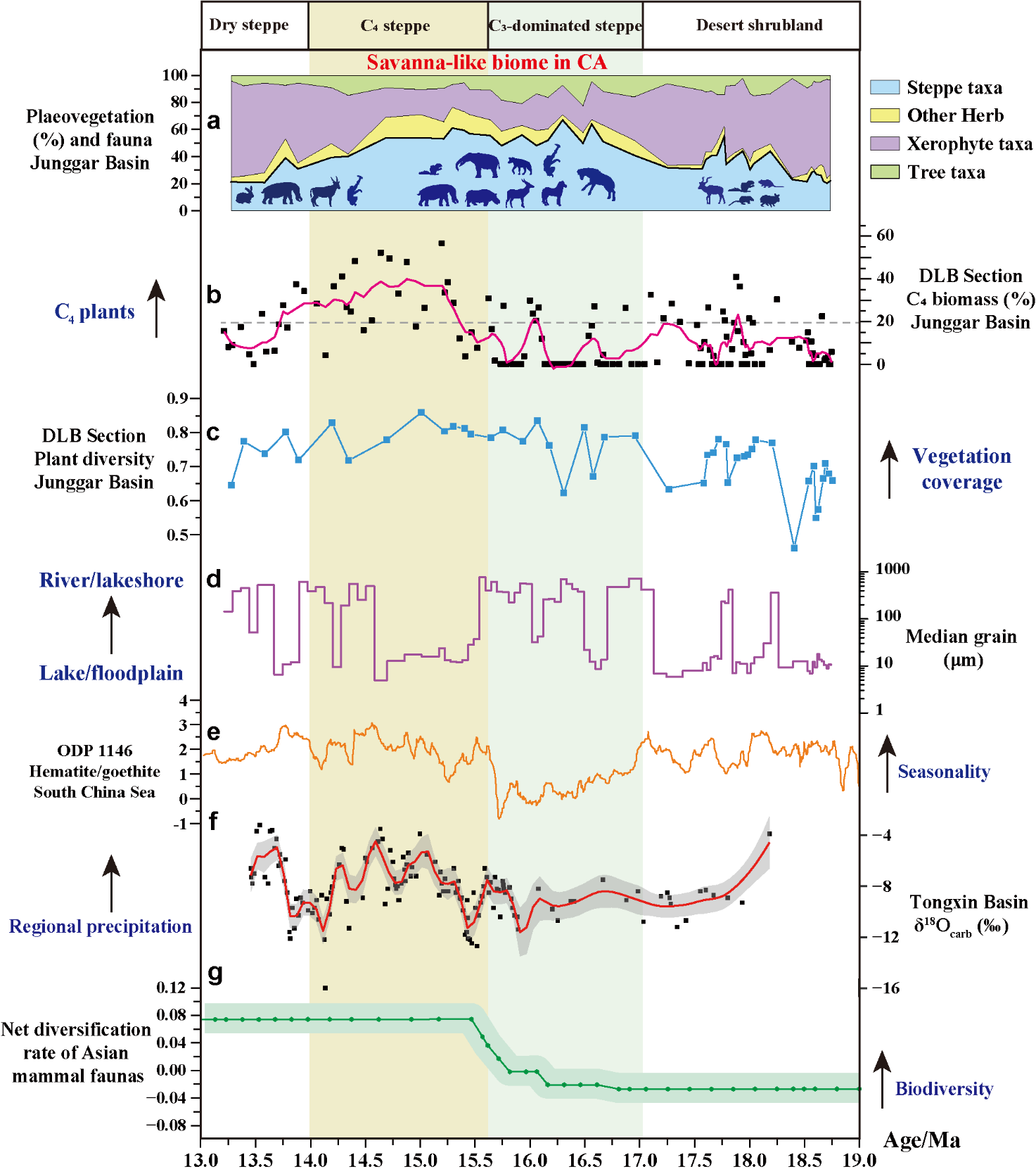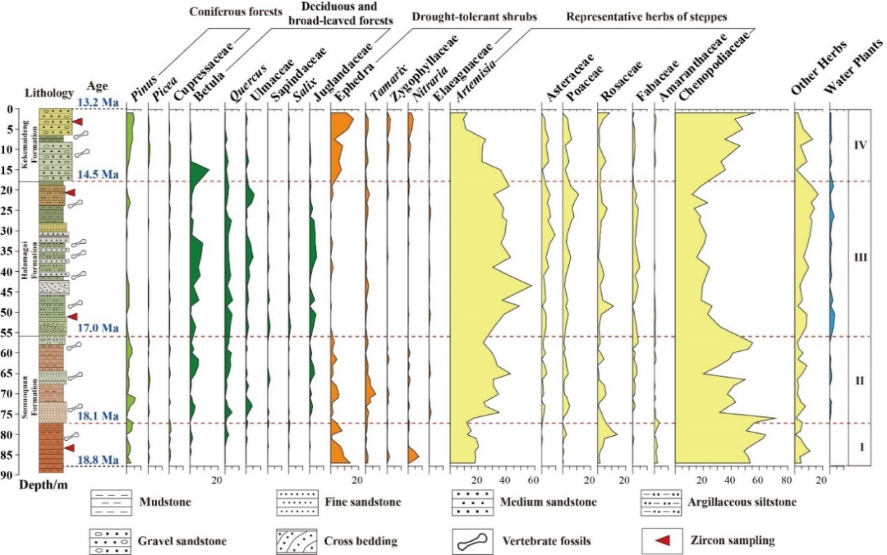 联合团队以“中新世生态植被-动物演变关系”为关键科学问题,重点调查了磁性和生物地层年代共同约束的准噶尔盆地夺勒布勒津剖面(18.8-13.2 Ma),通过孢粉、总有机质碳同位素、粒度、锆石U-Pb年龄、磁化率及古生物化石数据等多种指标,重建了沉积环境过程-区域植被气候-哺乳动物生境的演变历史。在此基础上,对区域草原生态系统及C4植被的扩张历史、控制因素和动力机制进行分析,并结合古植被数据集成、气候模拟实验和相关古气候证据,对MCO前后亚洲内陆的水文气候格局与植被-动物关系进行探讨。