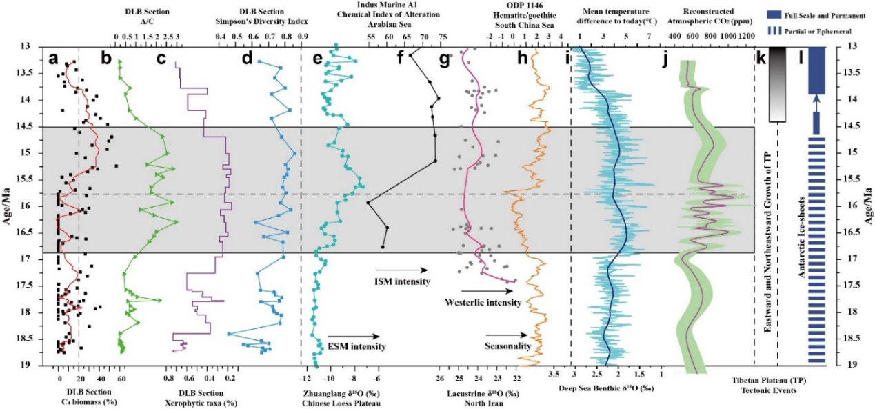 图2. 早-中中新世亚洲中部植被-气候记录与区域-全球驱动因素的对比(王建 供图)