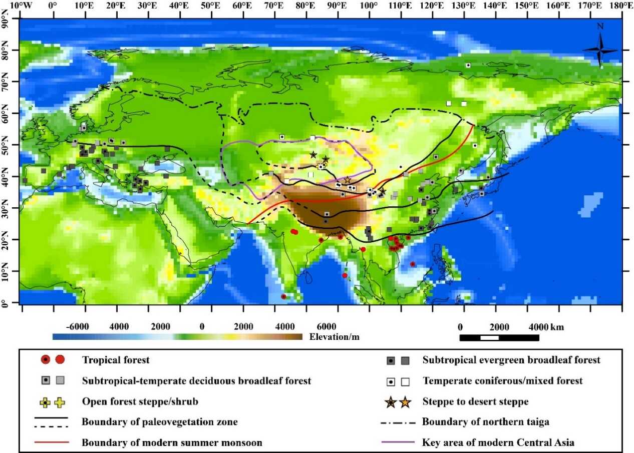 图3. 欧亚大陆18-14 Ma 期间古植被记录及相应的植被带梯度划分(王建 供图)