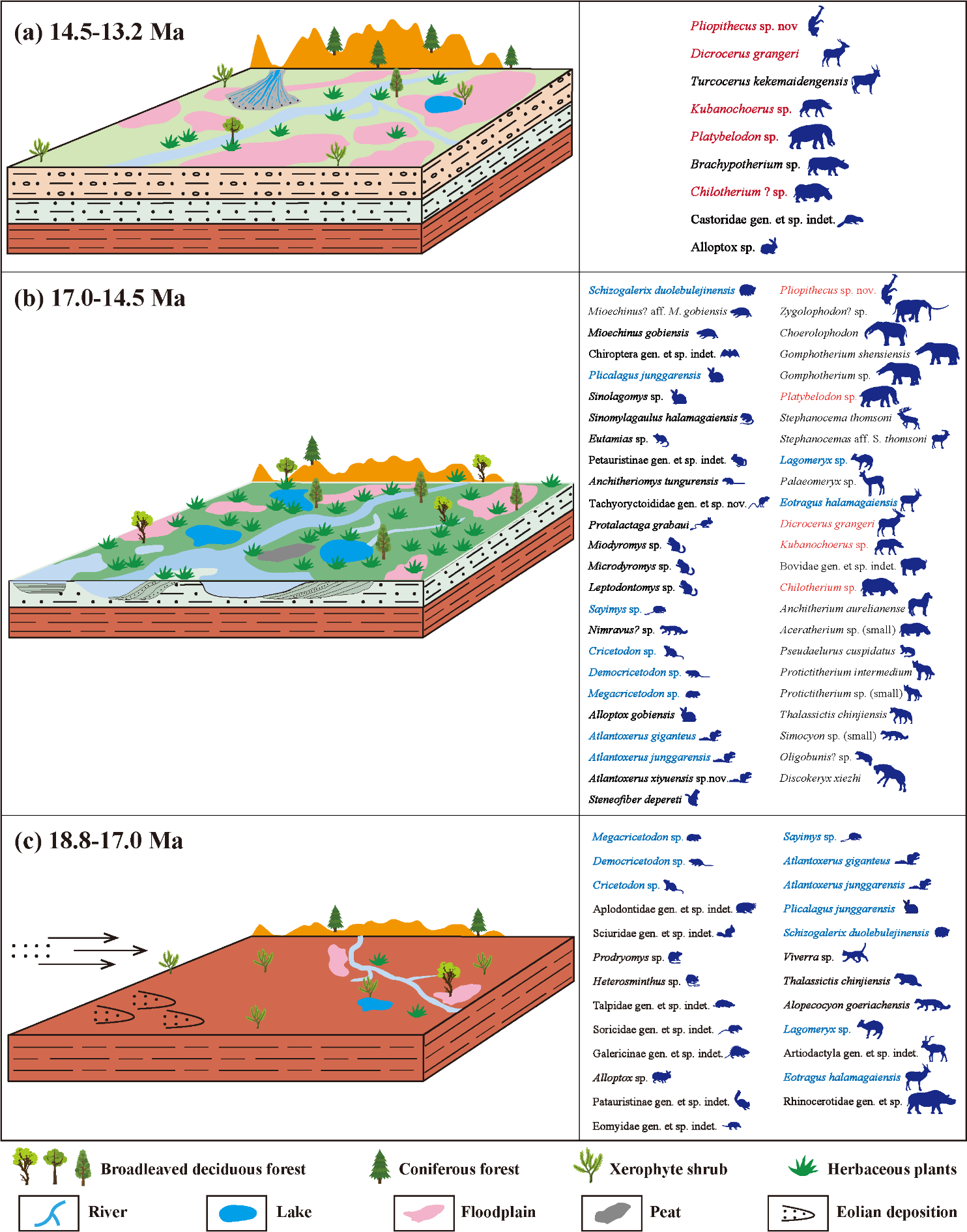 图5. 跨越中新世暖期过程中准噶尔盆地生态植被及哺乳动物类群的变化对比(王建 供图)