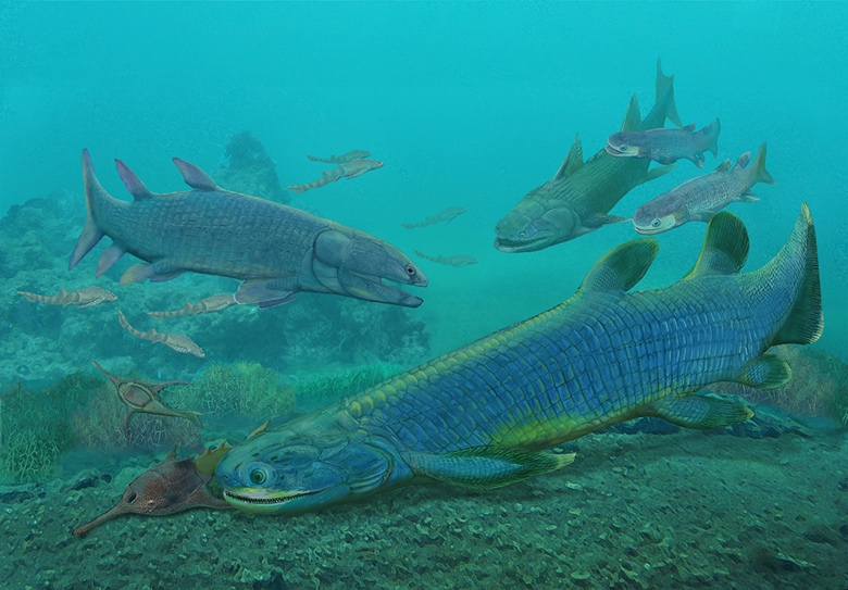 图2 广西南宁早泥盆世脊椎动物化石组合的生态复原图 (Brian Choo 绘制)