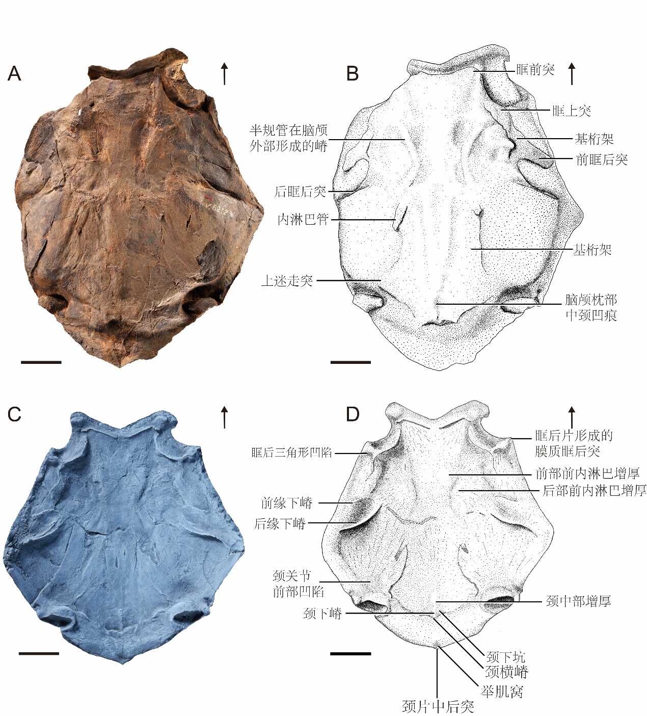 图1.巨扒皮鱼。A,正型标本 IVPP V6212 照片;B,正型标本素描;C,新标本IVPP V15043树脂翻模照片;D,新标本树脂翻模素描。比例尺长度3cm。