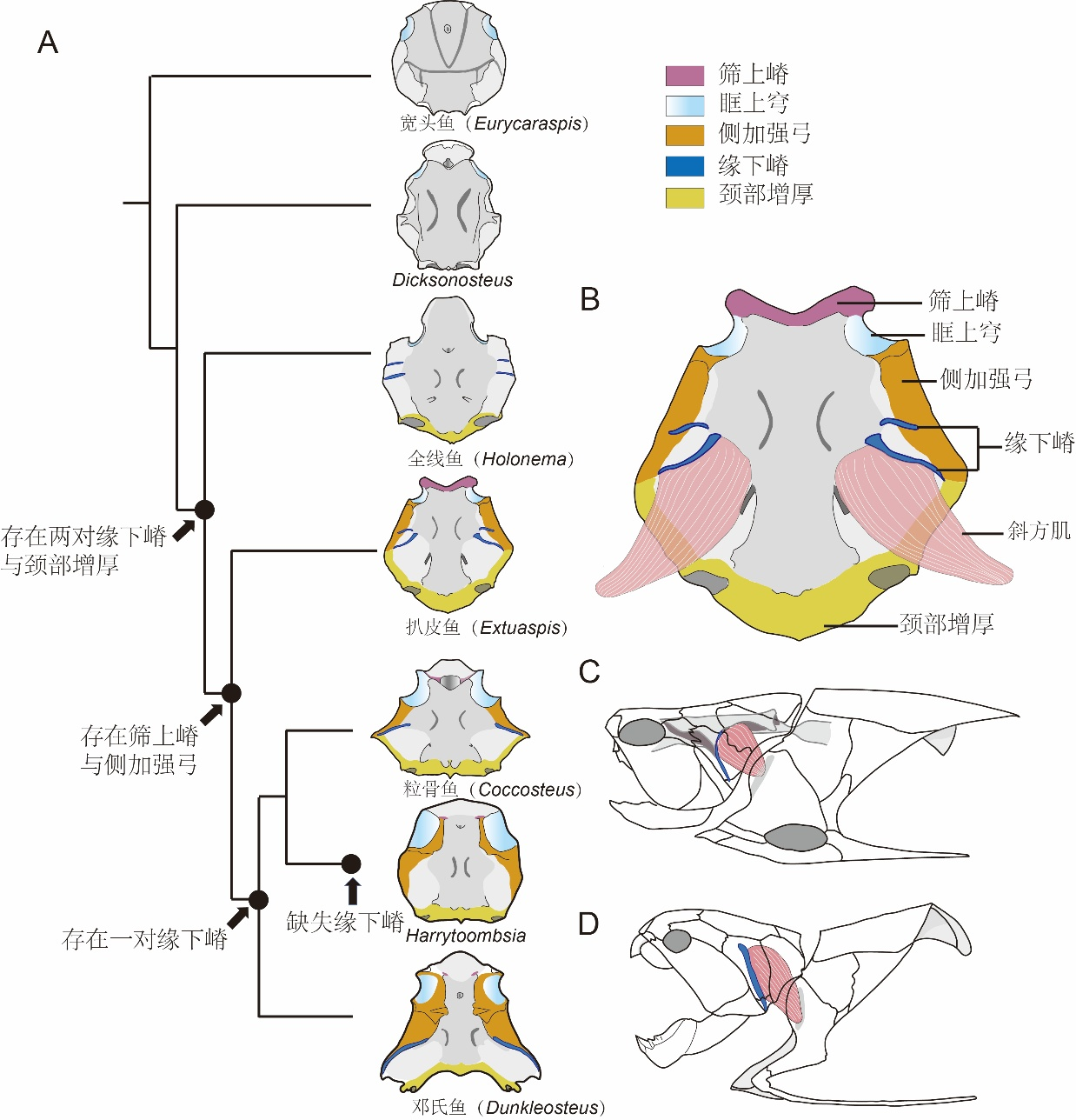 图2.颅顶甲内表面加强结构在节甲鱼类中的演化。A,简化的节甲鱼类演化树以及颅顶甲内表面加强结构的分布和演化;B,巨扒皮鱼颅顶甲内表面加强结构,示缘下嵴和斜方肌的位置关系;C,粒骨鱼(Coccosteus)的缘下嵴和斜方肌;D,邓氏鱼的缘下嵴和斜方肌。