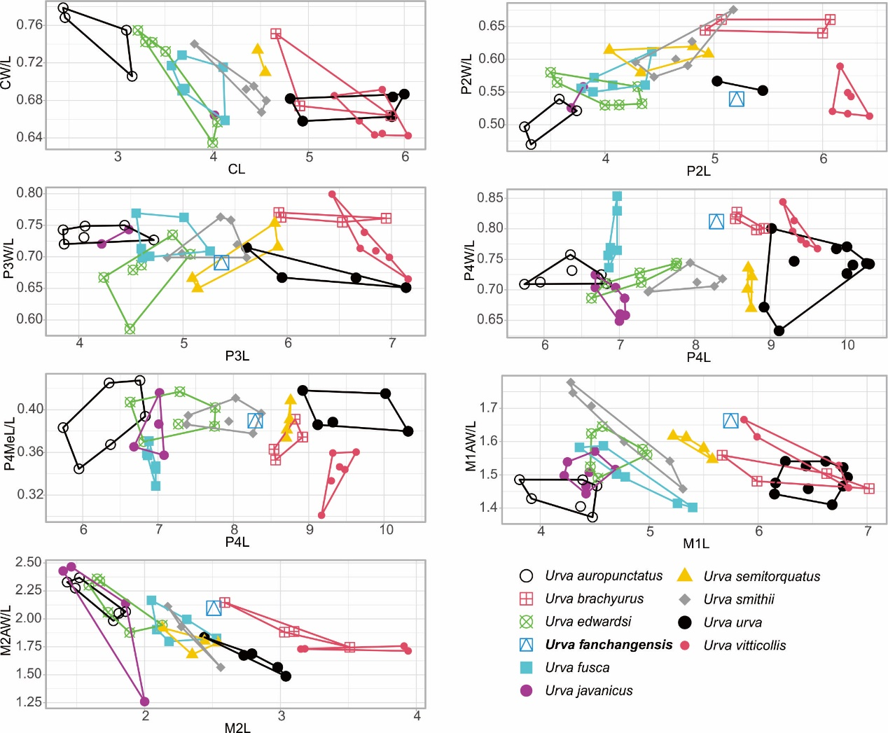 于是,时隔20多年后,古脊椎所安徽课题组对这一件獴的上颌骨标本进行了深入系统的再研究,发现该标本的确和现生食蟹獴存在显著的差异,也和现生的任何已知亚洲獴属的成员不同(图3)。其个体较小,而形态上介于现在华南和东南亚的食蟹獴和印度尼西亚的短尾獴之间,因此建立新种:繁昌獴Urva fanchangensis。