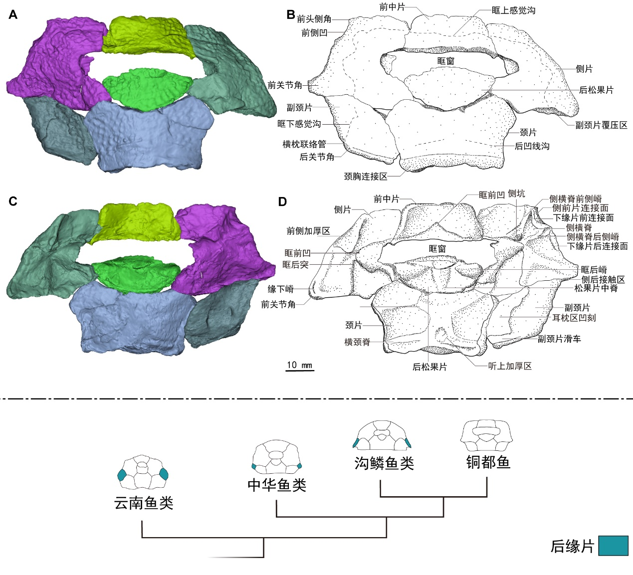 2011年,俄罗斯古鱼类学家莫洛施尼科夫(Moloshnikov)基于一件单独保存、不发育前外侧缘的副颈片标本建立了图巴鱼科,并猜测这种特殊形状的副颈片可能代表图巴鱼科缺失了后缘片,然而该推测一直缺乏实际证据。此次凹甲铜都鱼正型标本的发现证实了这一猜测,其完整保存的头部清晰地呈现出一种缺失后缘片的独特颅顶甲模式(图3)。此外,铜都鱼还具有较宽的眼眶与躯甲背侧脊不发育等特征。