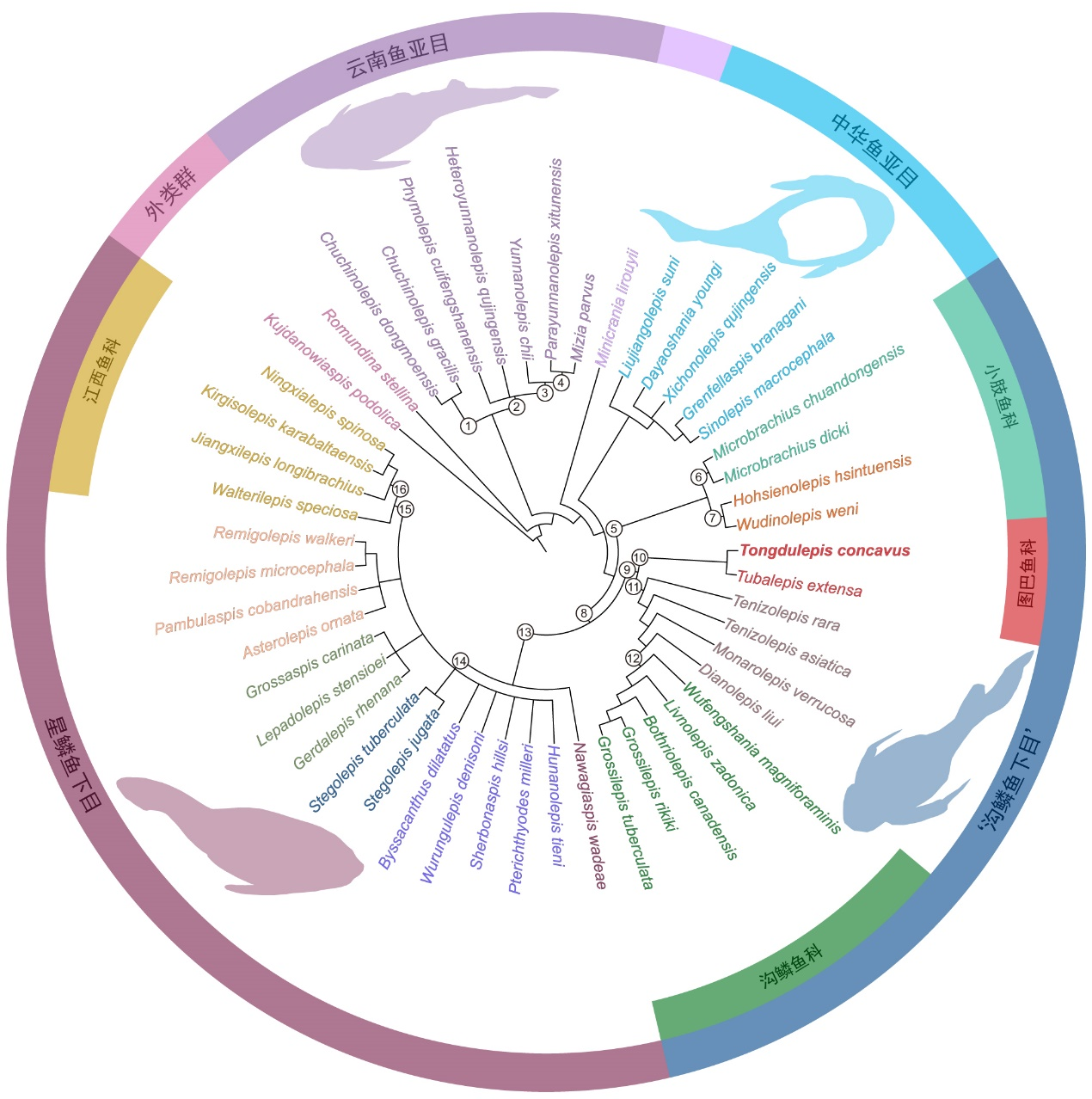 本次研究在前人工作的基础上,对胴甲鱼类的特征矩阵进行了深入梳理与补充。先前的胴甲鱼类研究常以模式种代表各个属作为最小操作分类单元(Operational Taxonomic Unit)建立矩阵。本次研究进一步细化种为最小操作分类单元,补充了11个新特征,建立了目前最详尽的胴甲鱼类特征矩阵。基于该矩阵的发育分析结果表明,铜都鱼所属的图巴鱼科被置于沟鳞鱼类的基干位置,构成了一个全新的支系 (图4,第10分支)。