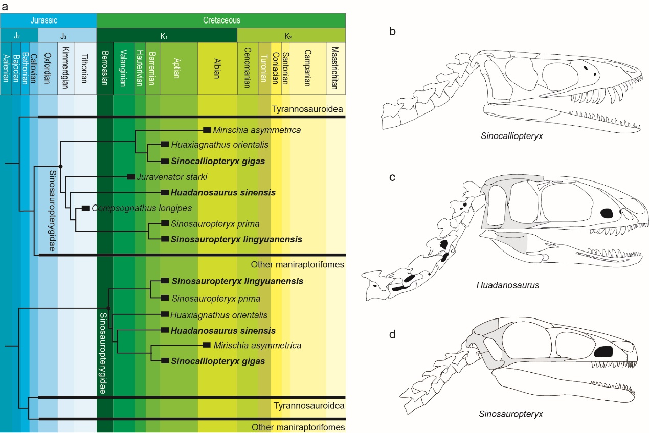 基于两个矩阵的中华鸟龙科系统演化树(a)和中华鸟龙科不同物种的头骨及颈椎形态对比(b-d)。b巨型中华丽羽龙,c中国华诞龙,d凌源中华鸟龙。