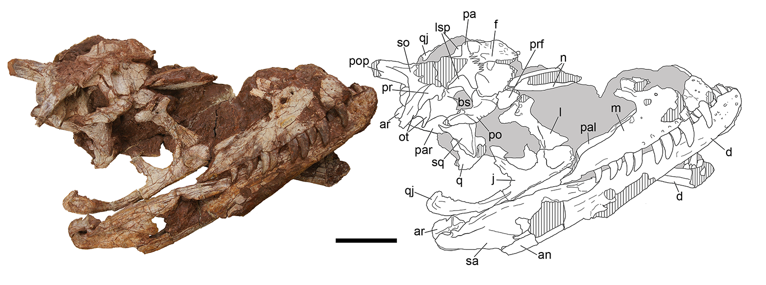 图1 元谋盗龙右侧头骨照片及线描图(邹毅供图,照片由吴肖春拍摄,比例尺为10厘米)