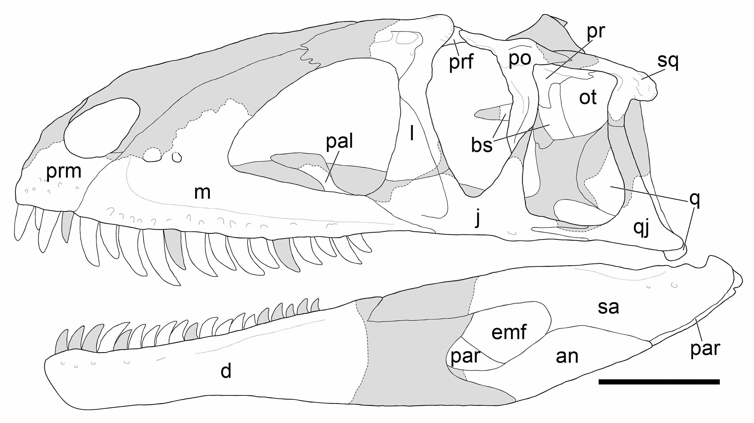 图3 元谋盗龙头骨复原图(邹毅供图,比例尺为10厘米)