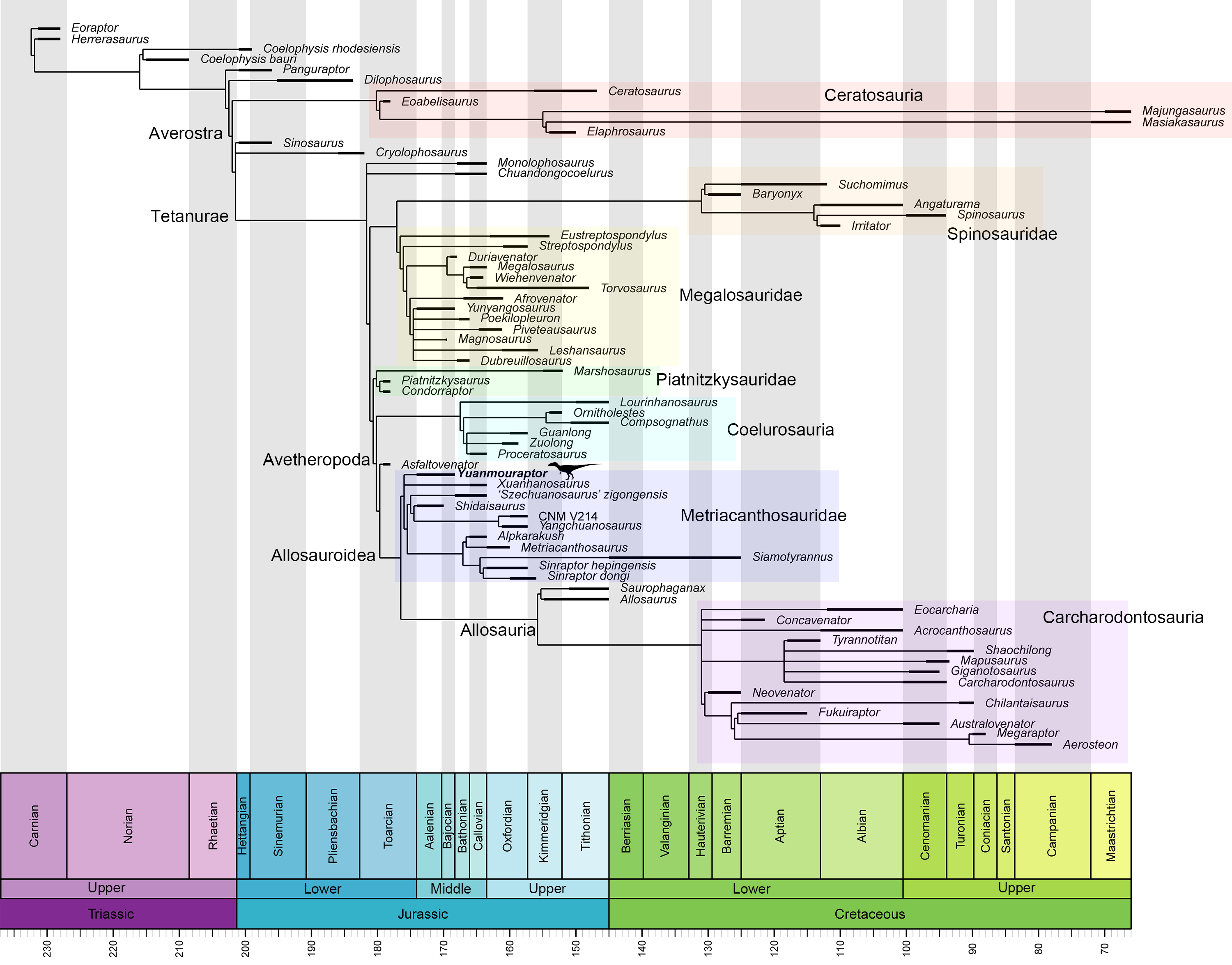 作为僵尾龙类(Tetanurae)的一个早期分支,中棘龙科成员主要被发现于亚洲、欧洲的中侏罗统至下白垩统地层中。中棘龙科中的典型代表如中棘龙、中华盗(猛)龙、永川龙等生活于晚侏罗世,其中体型较大者如永川龙的头骨长度能够达到1米以上。而生活于中侏罗世的元谋盗龙为中等体型的兽脚类恐龙,头骨长度约为60厘米。相较于那些年代较晚的中棘龙科成员,元谋盗龙在许多方面显得更为“原始”,如发育较弱的眼眶周围突起、轭骨与枢椎椎体上缺失气腔孔和突起程度较弱的颈椎前关节面等。不仅如此,元谋盗龙还具有一些出现在非中棘龙科成员中的特征,可能表明僵尾龙类早期演化过程中频繁的趋同演化现象。系统发育结果也佐证了元谋盗龙在分类位置上的特殊性,其位于中棘龙科内部最为基干的位置。元谋盗龙的发现增加了我国云南兽脚类恐龙的多样性,进一步增进了对于僵尾龙类兽脚类恐龙早期特征演化的认识。