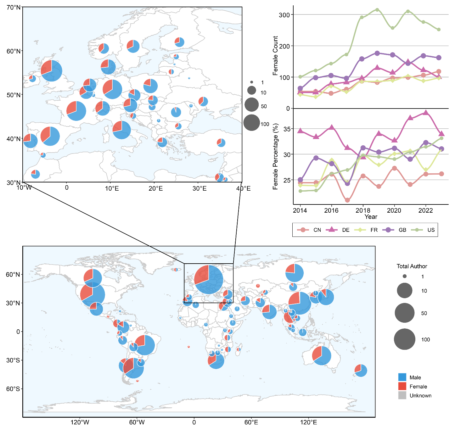 "打破'玻璃天花板'的进展:这张世界地图通过蓝红比例饼图展示了古脊椎动物学领域的性别差距现状。右侧趋势线揭示了过去十年主要研究国家中女性学者比例的缓慢增长态势。