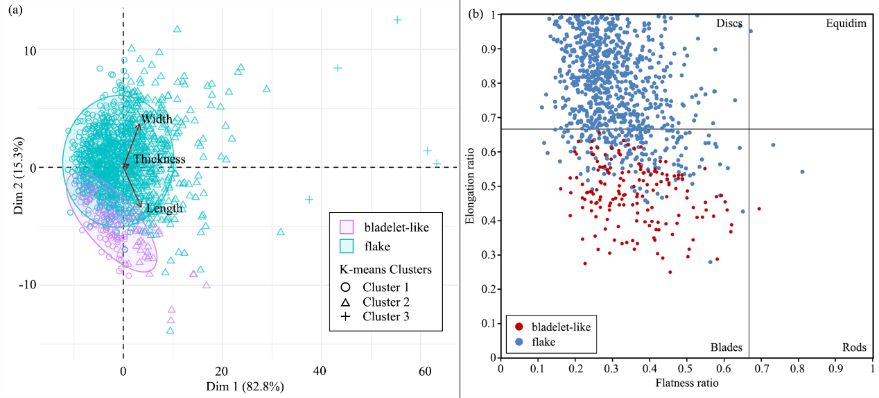 该文以云南佛洞地、四川富林、广东西樵山三处遗址所包含的小型石制品组合作为研究材料(图1),在技术类型学分析的基础上,重点对三个组合的剥片产品进行了多元的定量比较分析。文章综合利用主成分分析(PCA)、K均值(K-means)聚类分析和Zingg系统描述等多元分析方法(图2),对比分析三个小型石制品组合间的技术共性与差异。分析结果表明,三处遗址的小型石制品组合分别以小型砸击裂片、锤击似石叶、压制细石叶为主体,三者尽管在技术特征上存在明确差异,但在形态层面却共享着相似的功能优势(图3)。这三种类型分别代表了中国南方地区石器细小化进程的三种技术路径,表明中国南方史前人群通过不同的技术体系实现了石器的细小化演变。