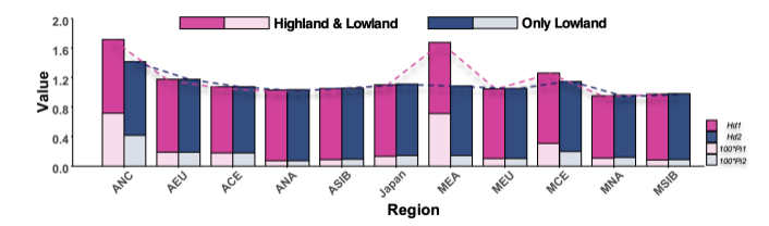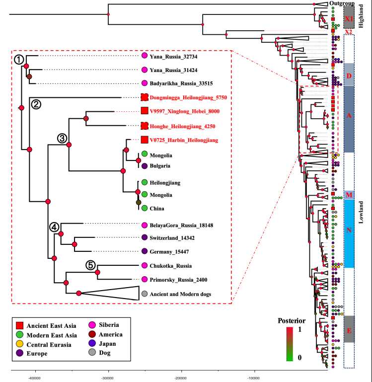 研究成功获取了来自中国北方的7例古代灰狼高质量线粒体全基因组数据(图1),并整合了497例古代和现代犬科动物的线粒体基因组数据进行共同分析。结果表明,(1)东亚灰狼从古至今一直保持着较高的母系遗传多样性,古代东亚灰狼分属7个不同的线粒体谱系(图2)。中国北方古代灰狼种群遗传多样性显著高于其他地区群体(图3)。(2)家犬可能由欧亚大陆东北部的灰狼群体驯化而来。欧亚大陆东北部灰狼种群至少存在5个相对较深的谱系与A单倍群(家犬的主要类型)中的古代和现代家犬存在密切遗传关联,支持了家犬祖先来自欧亚大陆东北部地区。(3)一例来自黑龙江哈尔滨的古代灰狼样本代表了一个此前未被发现的古老灰狼谱系。(4)此外,青藏高原东北缘可能是高地狼、低地狼和家犬混合的关键区域。青藏高原的灰狼群体形成了一个高度分化的独立母系谱系(X1),与周边低海拔灰狼群体存在显著遗传差异。青藏高原东北缘的金禅口遗址发现具有高地狼和低地狼母系特征的个体共存(图2,4)。先前研究表明,该遗址还出土了单倍群类型为A1b3和C的家犬个体,暗示了该区域可能是高地狼、低地狼和家犬之间混合的关键区域。本研究对理解东亚灰狼母系遗传历史以及家犬起源提供了关键数据,有力地支持了欧亚大陆东北部是东亚家犬起源核心区域的观点。该研究也提示多角度分析对深入理解灰狼向家犬过渡过程中的种群动态和混合事件至关重要。