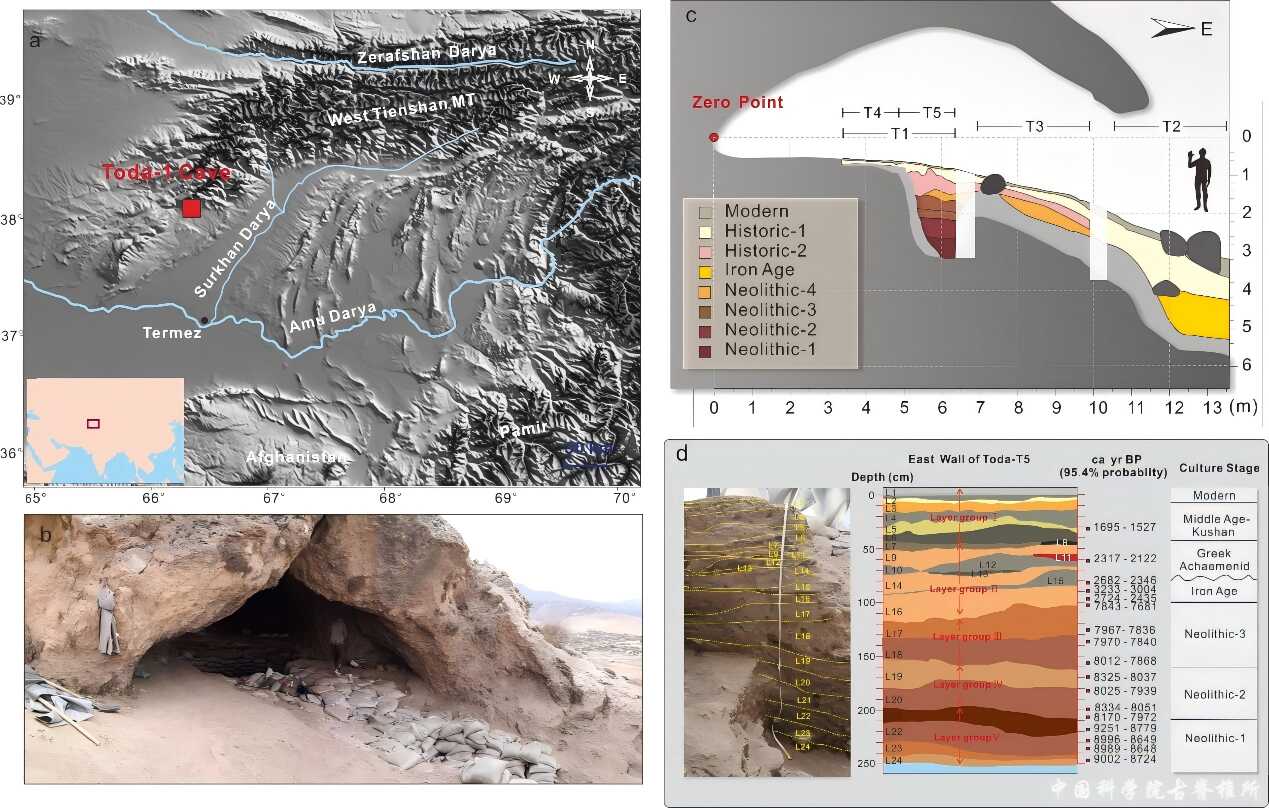 中亚地区位于欧亚大陆腹地,连接东亚与西亚、南亚与北亚,是古代人群与文化文明交流的十字路口。其早期农牧业起源研究一直处于空白状态,被称作农业起源与扩散传播环节上一段“丢失的链条”。近年来,联合研究团队在乌兹别克斯坦南部的山麓地区开展田野调查,发现了托达(Toda)1号洞穴,并经过三个季度(2017–2019年)的发掘,揭露出新石器时代早期的文化层。