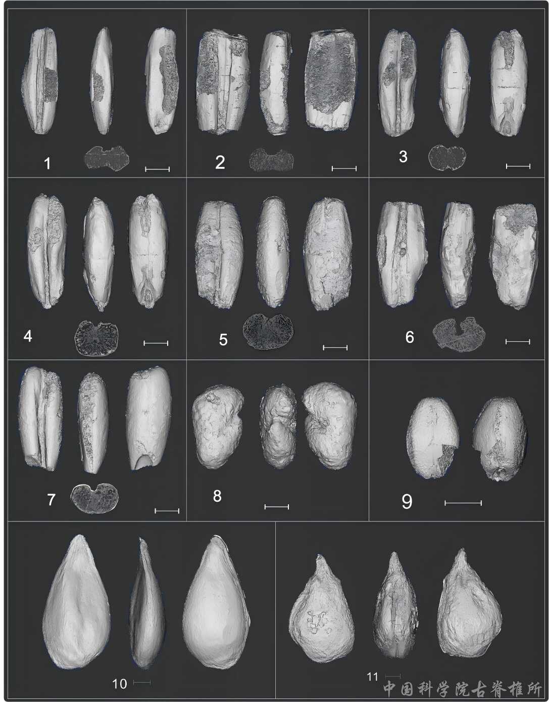 团队通过系统的植物考古研究,发现了属于中亚前陶新石器时代的大麦、豆类及多种植物种子和果实,其中最古老的大麦种子年代为9133–8970 cal yr BP。这证明至少距今9000年前,大麦采集在中亚山麓地区已成为一种重要的生产方式,并延续了上千年。这些大麦谷粒包括壳大麦和裸大麦两种,在一些关键形态特征上(如厚度-宽度比)落在野生谷物的区间内,属于野生大麦类型。但其中近半数为裸大麦,其比例显著高于同期近东地区的早期农业遗址,可能指示了不同的演化路径。