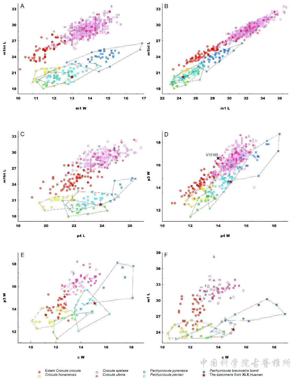 斑鬣狗是欧亚、非大陆更新世(尤其是中、晚期)最常见的一类鬣狗,不同时代或不同地点曾经发现了大量的标本,并先后据此创建和命名十个左右不同的种。对于它们的有效和独立性,目前学界还存在着相当大的分歧和争议。有的认为这些斑鬣狗的绝大多数种是真实有效的,理应予以保留,但也有人对此表示强烈怀疑,甚至主张将所有的更新世斑鬣狗全部划归现生的斑鬣狗Crocuta crocuta。2008年的研究曾将淮南的斑鬣狗标本鉴定为现生种,其实就是受此观点的极大影响。此次,该团队在掌握大量的牙齿测量数据和形态信息(尤其是河南斑鬣狗Crocuta honanensis)后,对这一度盛行的单种属观点提出了挑战和批驳,指出河南斑鬣狗无论是牙齿测量数据(图2和3)还是形态结构(主要是p4和m1)均显著不同于其它的斑鬣狗,其极度退化的p4前附尖甚至表明它极可能处于一个非主流的绝灭旁支上。
