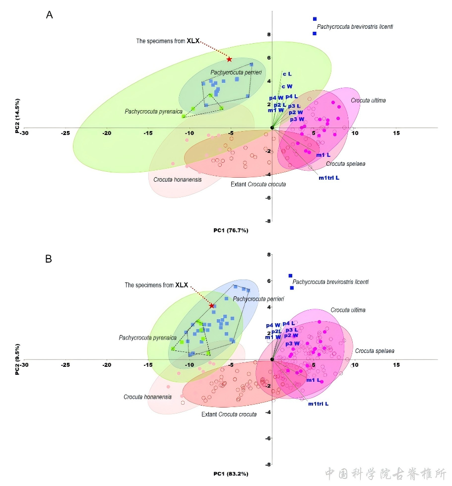 借助于一系列的形态学比较和数据统计分析(单元,双元和多元分析等,见图2和3),该团队最终证实大居山西裂隙的标本并非斑鬣狗,而是佩里硕鬣狗(Pachycrocuta perrieri); 淮南地区只有大丁山裂隙的标本才是斑鬣狗的真正代表,极可能为最后斑鬣狗(Crocuta ultima)。不仅如此,该团队还以此为契机,首次对斑鬣狗和硕鬣狗的齿颌形态(重点是非裂齿)进行了系统性的比较研究,为未来的标本鉴定和研究提供了一套实用、易操作的齿颌形态鉴定指南。此外,该团队还充分探索和发掘了其齿颌形态差异背后隐藏的生态功能意义,结果表明斑鬣狗和硕鬣狗在捕食和摄食等一系列功能和行为上已展现显现的分化。