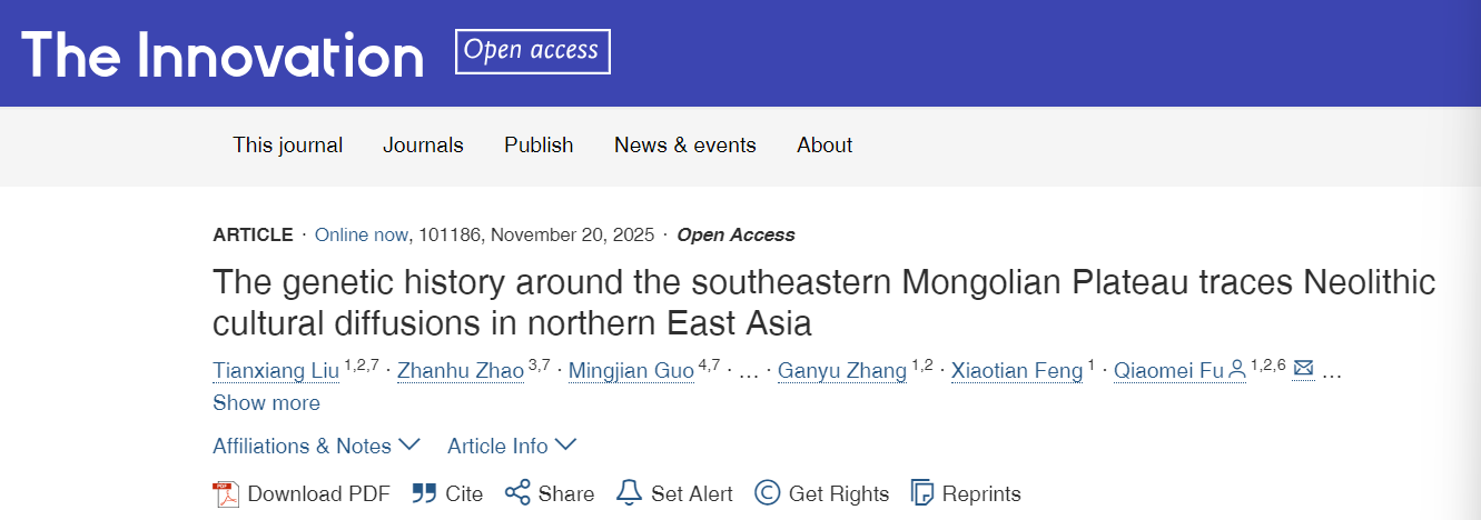末次盛冰期结束以来,位于蒙古高原东南缘的我国坝上草原地区的考古遗存,体现人群生活方式由高流动性狩猎采集向定居化农业生产的重大转变,以及旧石器晚期至新石器早中期的多种文化复杂互动现象。然而,关于这一地区在东北亚早期人群发展关键阶段的历史地位、与周边区域人群的互动关系、以及早期社会组织模式等问题,长期以来仍缺乏系统性认识。为回答上述一系列关键问题,中国科学院古脊椎动物与古人类研究所付巧妹科研团队与河北省文物考古研究院、厦门大学等单位合作,对来自北方草原坝上地区距今8800年—5000年前的35例古代人骨样本开展高分辨率的系统性核基因组研究。研究重构了距今8800-7500年前蒙古高原东南缘以家庭为核心的社会组织模式,是目前东亚地区最早的社会结构研究,为理解史前社会结构演化提供了新视角;蒙古高原东南缘人群在距今8800-7500年间保持高度遗传连续性,表明这一区域早期文化的更替主要基于本地人群的持续发展;阐明蒙古高原东南缘祖源对环贝加尔湖区域、蒙古高原北部区域、及西辽河流域新石器时期人群有显著遗传贡献,提示这一过程可能与细石叶技术及陶器传统的传播、交流同步;解析了距今5700-5000年间该区域与蒙古高原东北部及西辽河流域红山文化人群存在直接遗传联系,表明文化变革与人群迁徙密切相关。研究揭示我国蒙古高原东南缘不仅是新石器时代社会的重要策源地,还是新石器文化的交汇地、北方草原文化的缘起地,是中华民族多元一体进程的重要早期源头之一。相关研究成果于今年11月20日在《The Innovation》杂志上线发表。