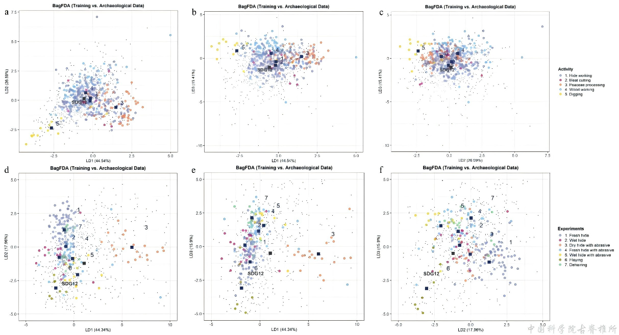 功能分析以传统的定性观察结合高精度的三维表面纹理定量分析展开,并首次在骨器功能研究中引入 Bootstrap aggregating–Flexible Discriminant Analysis(BagFDA)机器学习方法提取最具诊断性的磨损纹理特征。定性方面,研究通过宏观和共聚焦显微镜放大5-50×观察活动端的磨圆、抛光、微划痕分布与方向性,排除了这些工具曾被用于切肉和挖掘茎块植物等活动的可能性。