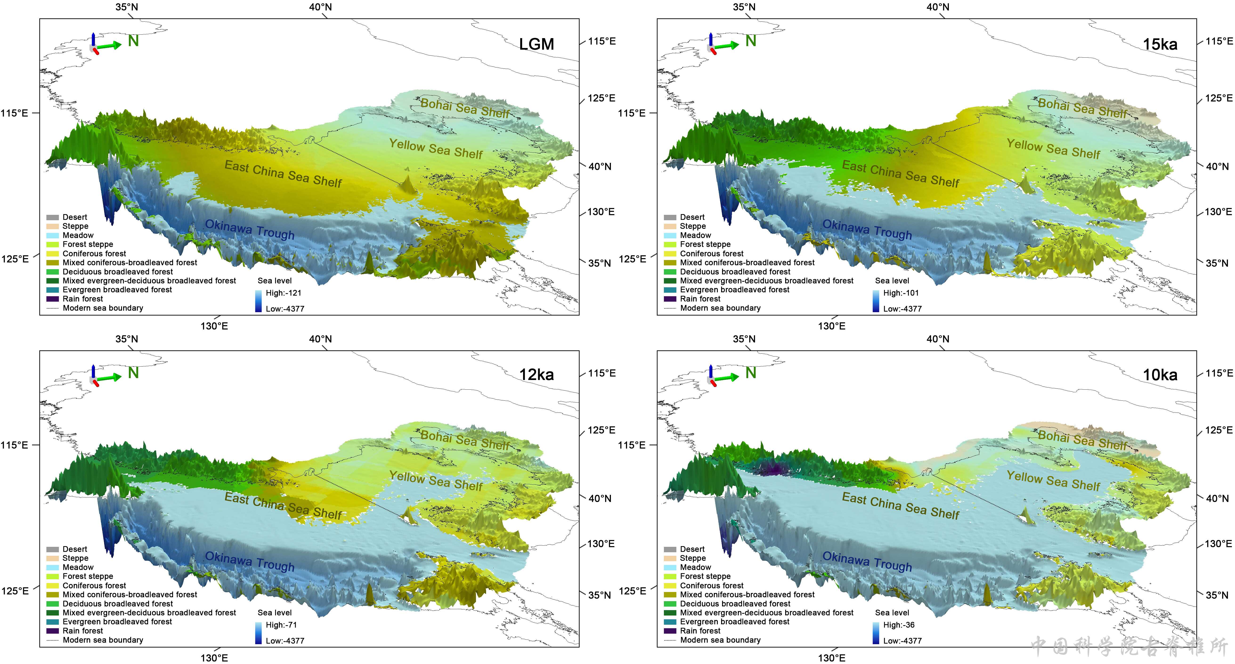 图2 中国东部海岸带LGM、15ka、12ka、10ka植被格局。