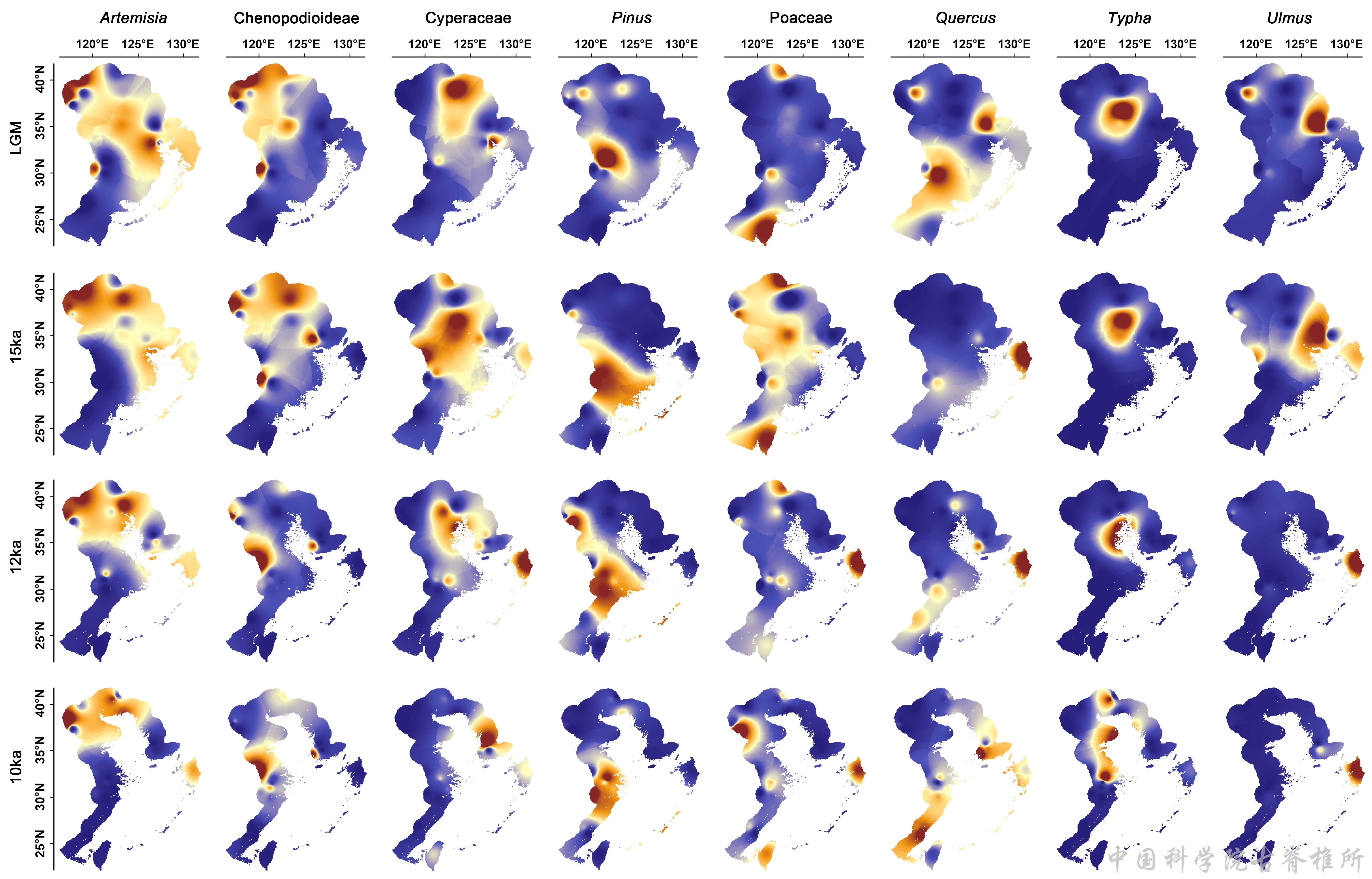 近日,《国际第四纪》(Quaternary International)发表了题为“Vegetation pattern and succession from LGM to early Holocene in the eastern coastal zone of China”的研究论文。研究聚焦中国东部海岸带-陆架区,海洋区域包括渤海、黄海、东海大陆架,陆地区域包括中国大陆东部、台湾岛、朝鲜半岛西部和日本九州岛西南部等区域的现代海岸线向陆延伸100km的范围(图1)。基于研究区内已发表的34个钻孔的孢粉数据,利用生物群区化方法重建末次盛冰期至早全新世特征时段(LGM、15 ka、12 ka、10 ka)的植被格局(图2),并结合研究区内已发表沉积相的数据分析和主要植物类群空间分布(图3),探究了影响植被格局变迁的因素。