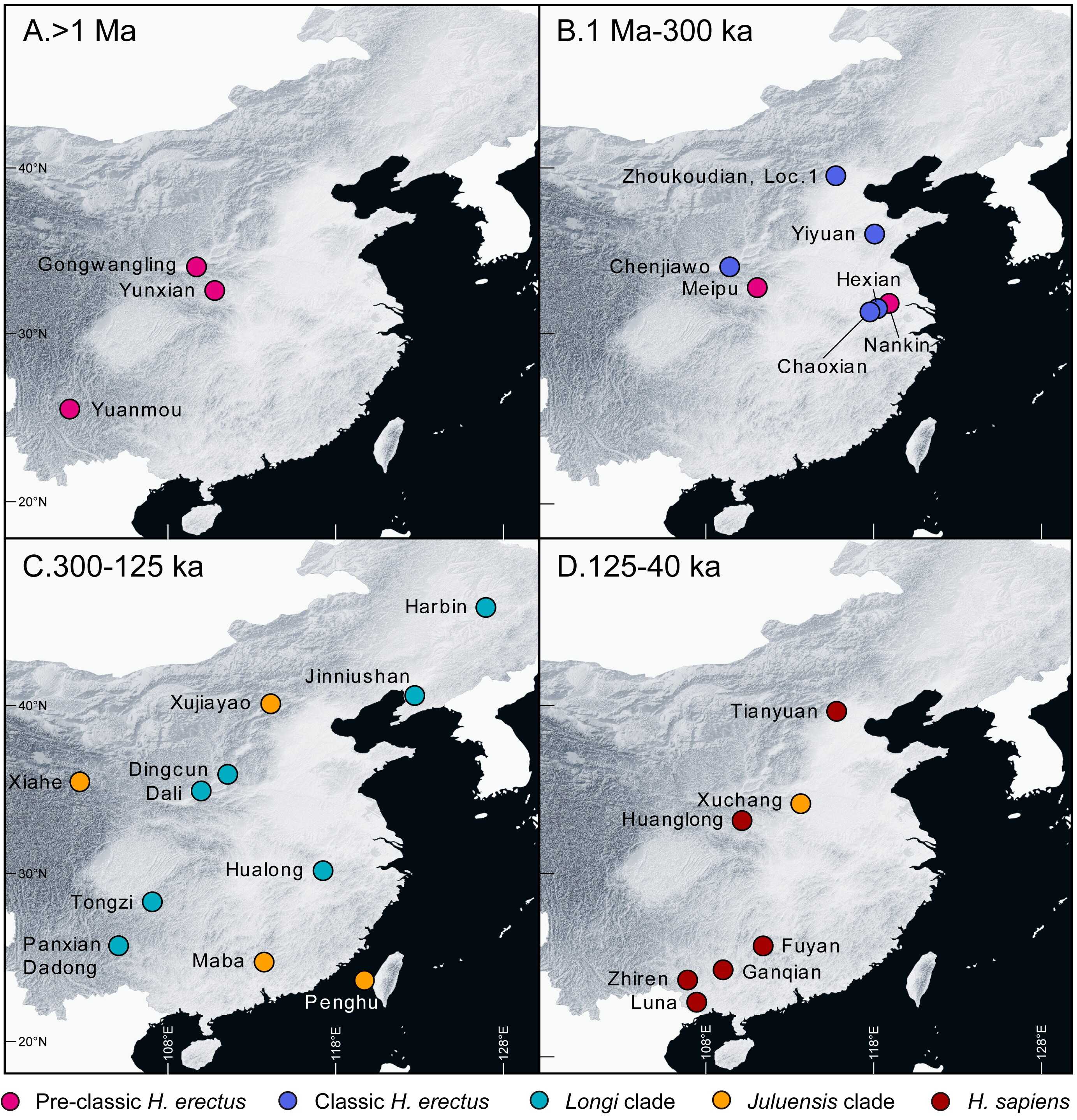 图1.过去两百万年间(200-4万年)中国关键古人类化石记录的地理分布