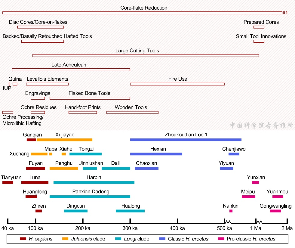 图2. 过去两百万年间(200-4万年)中国关键古人类化石与行为记录