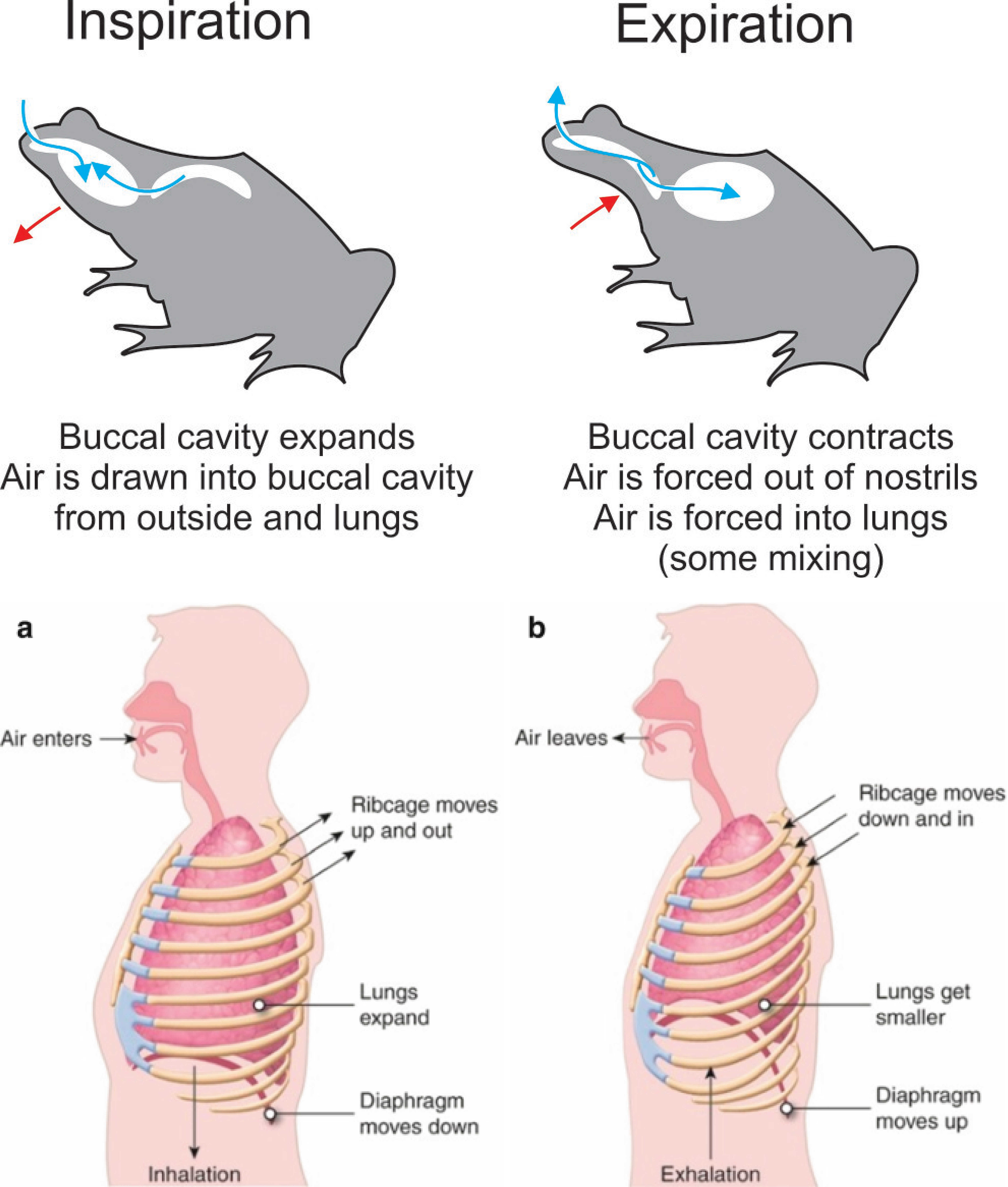图1 上排为口腔泵吸,下排为胸廓呼吸 (https://en.wikipedia.org/wiki/Buccal_pumping#/media/File:Two_stroke_buccal_pumping.jpg)